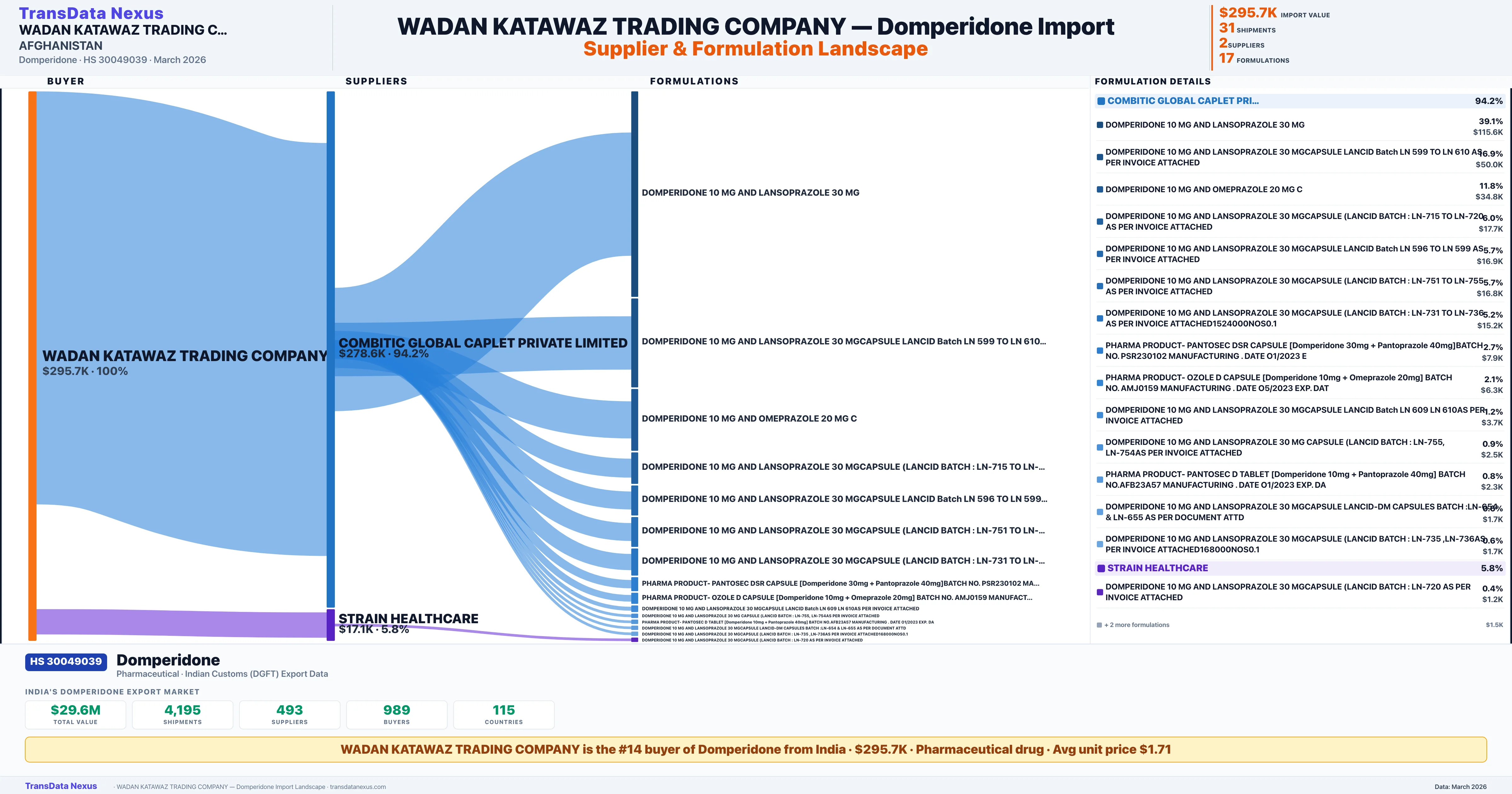 Pharmaceutical Importer Β· #14 buyer for Domperidone Β· $295.7K import value Β· 31 shipments Β· AFGHANISTAN Β· DGFT Verified