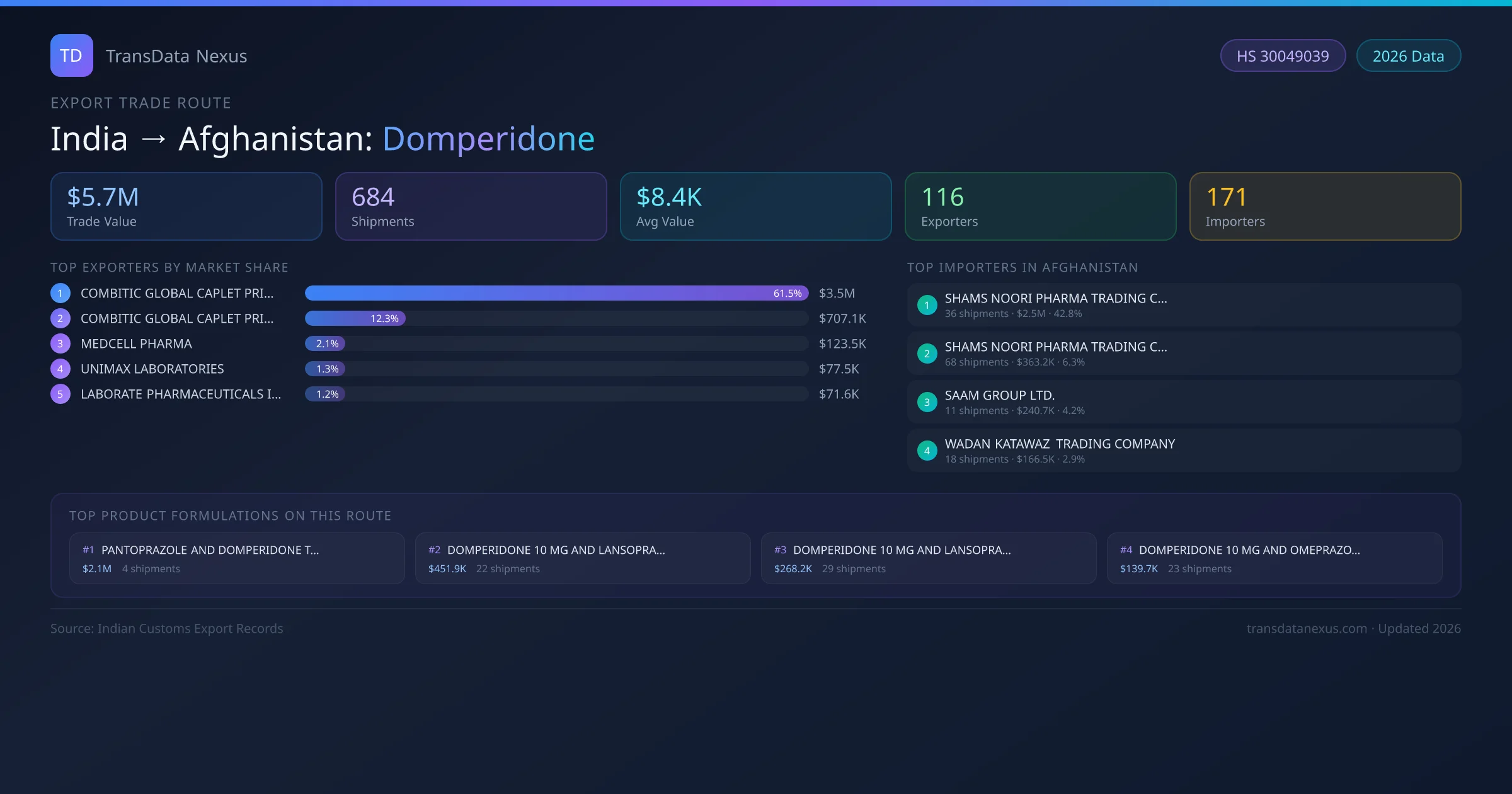 India has recorded 684 verified shipments of Domperidone exported to Afghanistan, representing a combined trade value of $5.7M USD. This corridor is served by 116 active Indian exporters, with an average shipment value of $8.4K USD. The leading Indian exporter is COMBITIC GLOBAL CAPLET PRIVATE LIMITED, which accounts for 62% of total export value with 205 shipments worth $3.5M USD. On the buying side, SHAMS NOORI PHARMA TRADING COMPANY is the largest importer in Afghanistan with $2.5M USD in purchases. The top 3 suppliers — COMBITIC GLOBAL CAPLET PRIVATE LIMITED, COMBITIC GLOBAL CAPLET PRIVATE LIMITED , MEDCELL PHARMA — together control 76% of total trade value on this route. All data sourced from Indian Customs (DGFT) shipping bill records. Values reported in FOB USD.