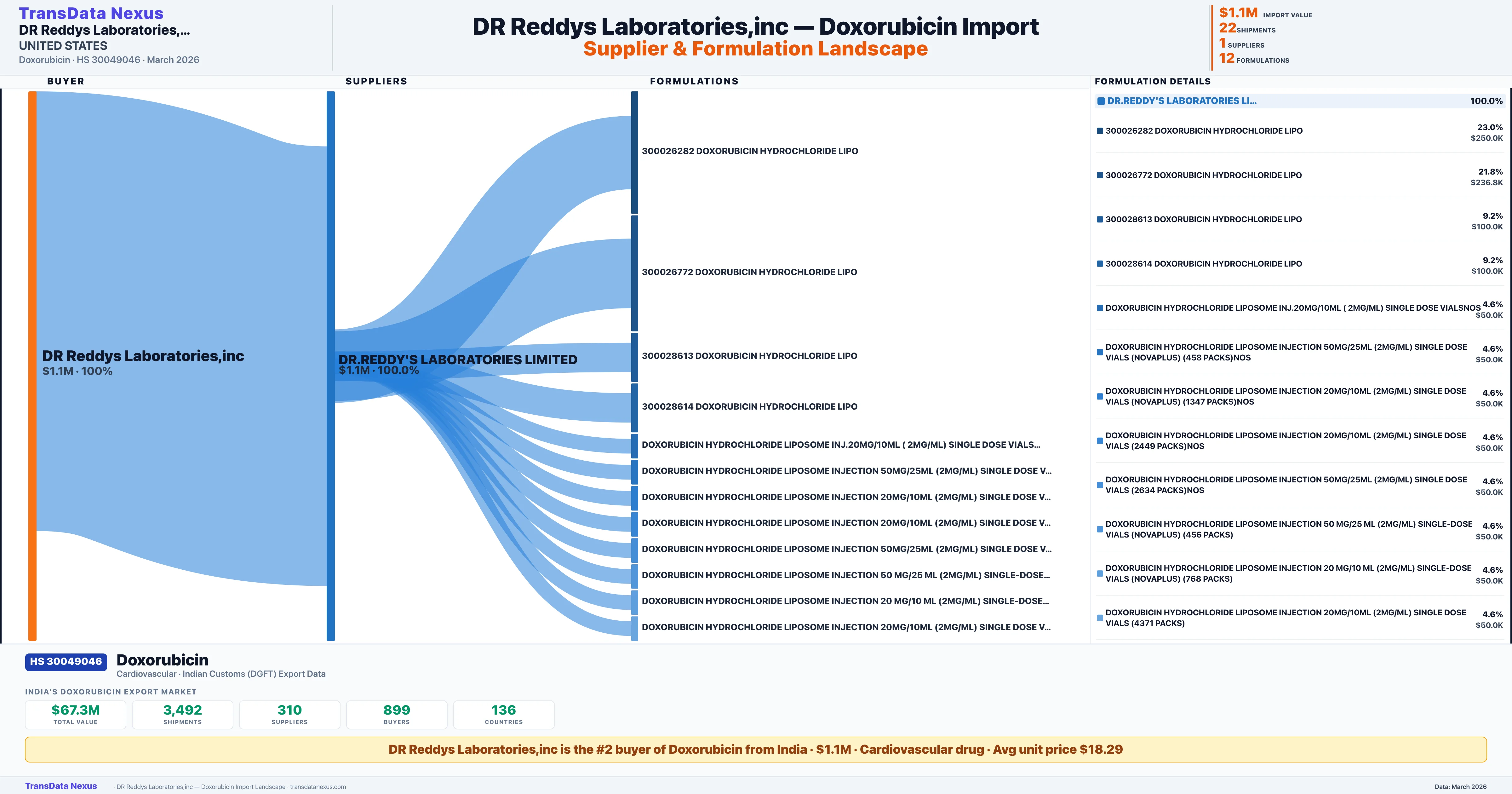 DR REDDYS LABORATORIES,INC sources Doxorubicin from 1 verified Indian supplier: DR.REDDY'S LABORATORIES LIMITED ($1.1M, 100.0%). This is based on 22 customs records.