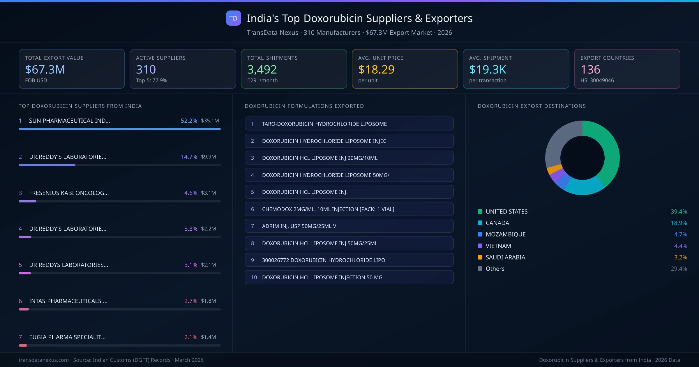 India has 310 active doxorubicin exporters with a combined export market of $67.3M across 3,492 shipments to 136 countries. The top 5 suppliers hold 77.9% of total export value.