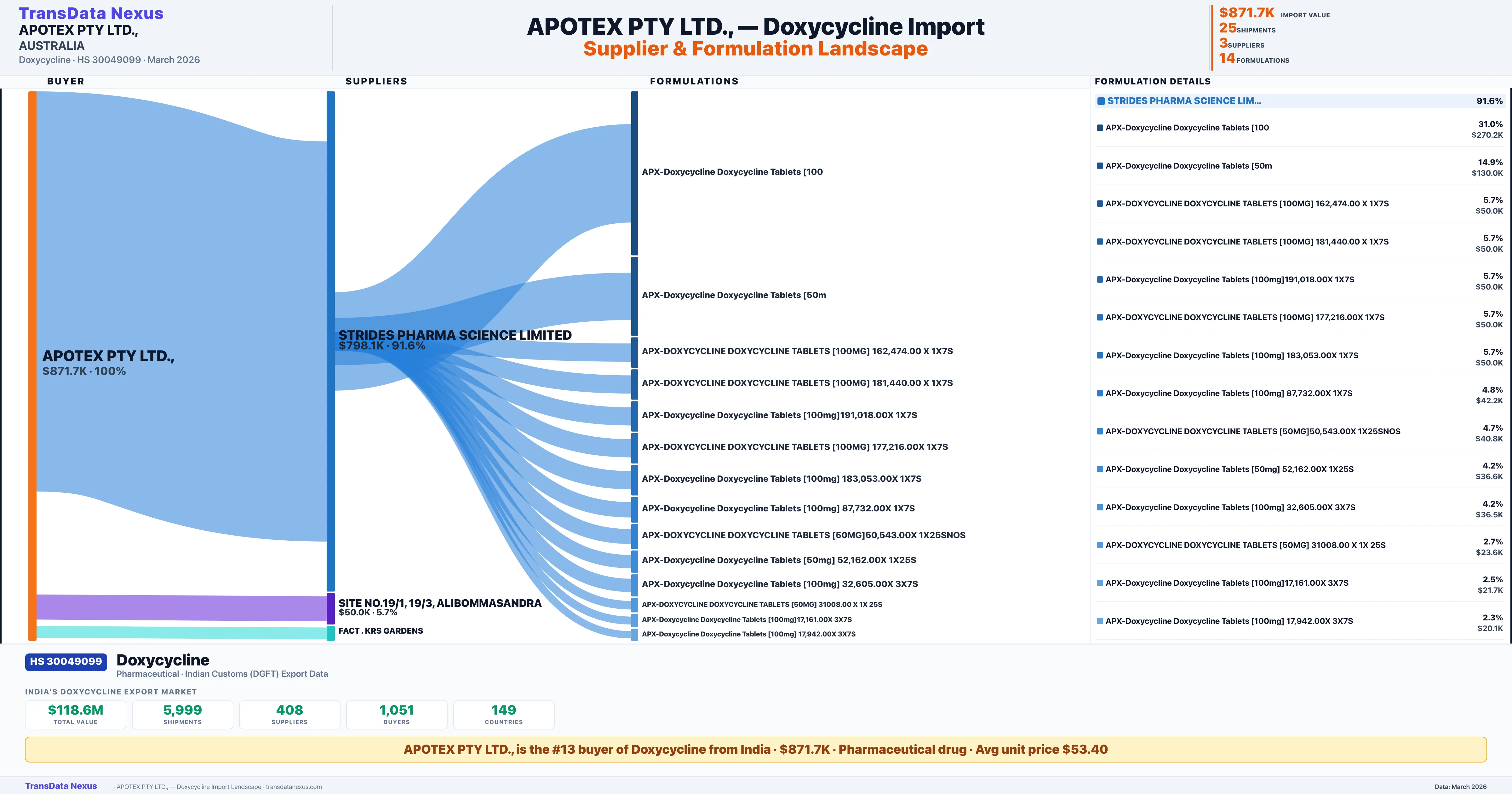 APOTEX PTY LTD., sources Doxycycline from 3 verified Indian suppliers: STRIDES PHARMA SCIENCE LIMITED ($798.1K, 91.6%), SITE NO.19/1, 19/3, ALIBOMMASANDRA ($50.0K, 5.7%), FACT . KRS GARDENS ($23.6K, 2.7%). This is based on 25 customs records.