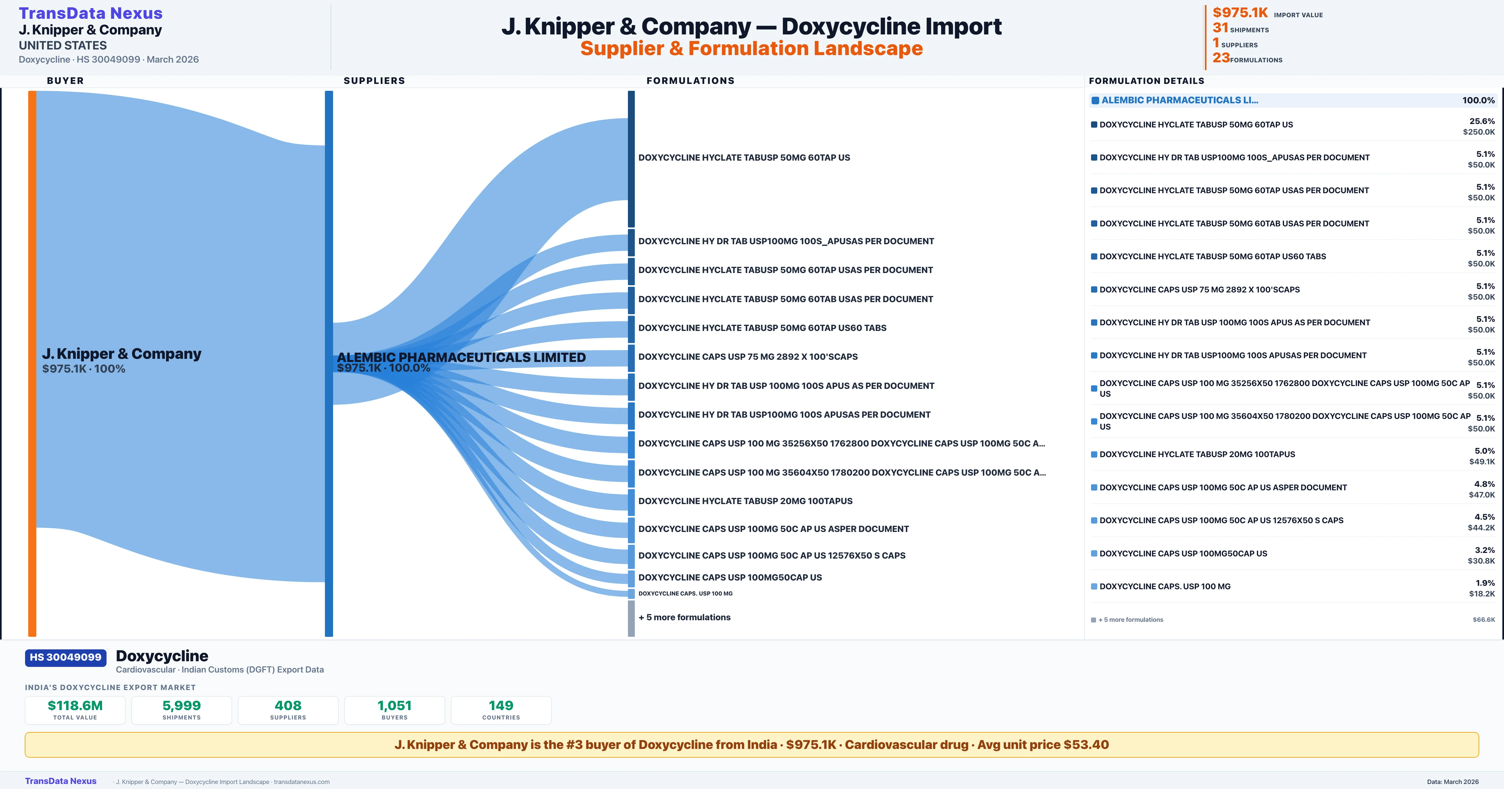 J KNIPPER COMPANY sources Doxycycline from 1 verified Indian supplier: ALEMBIC PHARMACEUTICALS LIMITED ($975.1K, 100.0%). This is based on 31 customs records.