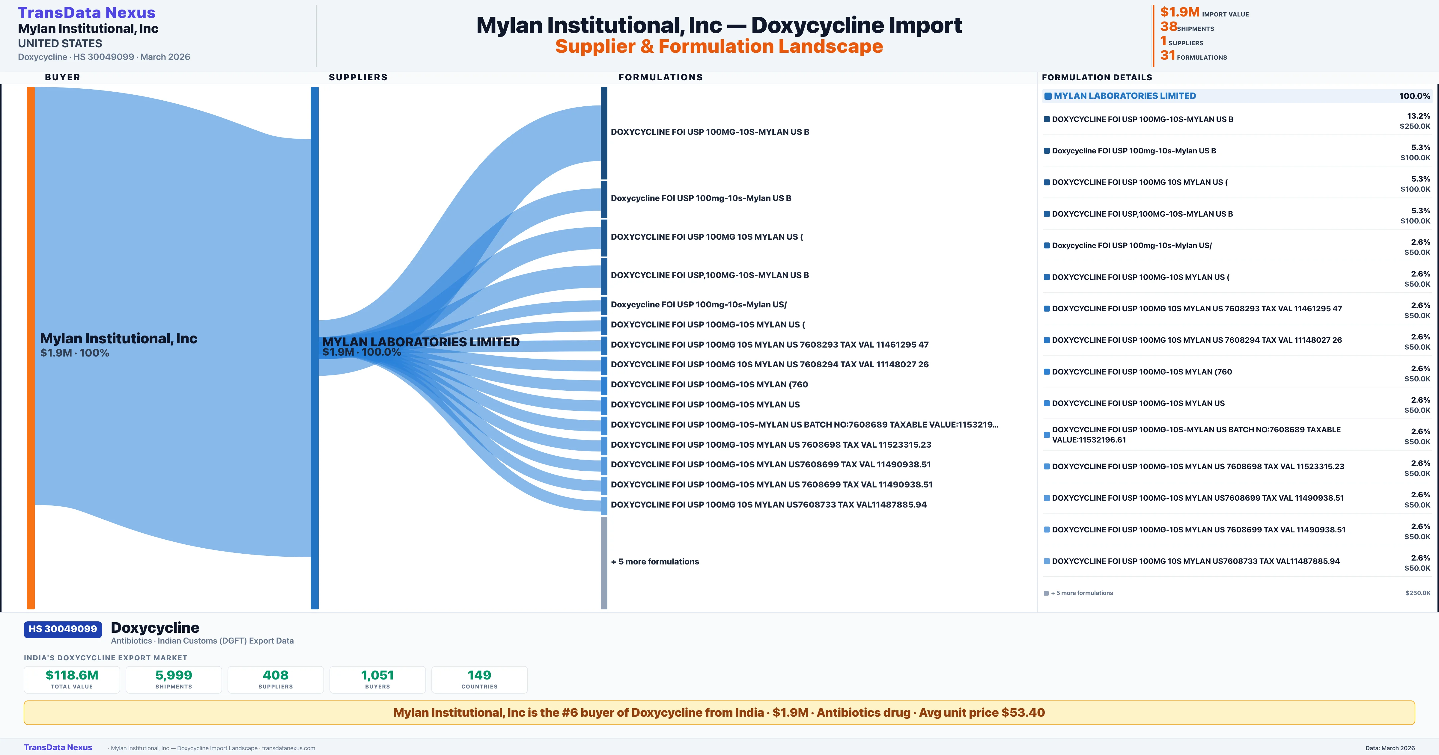 MYLAN INSTITUTIONAL INC sources Doxycycline from 1 verified Indian supplier based on 38 customs records. The primary supplier is MYLAN LABORATORIES LIMITED accounting for 100.0% of imports.