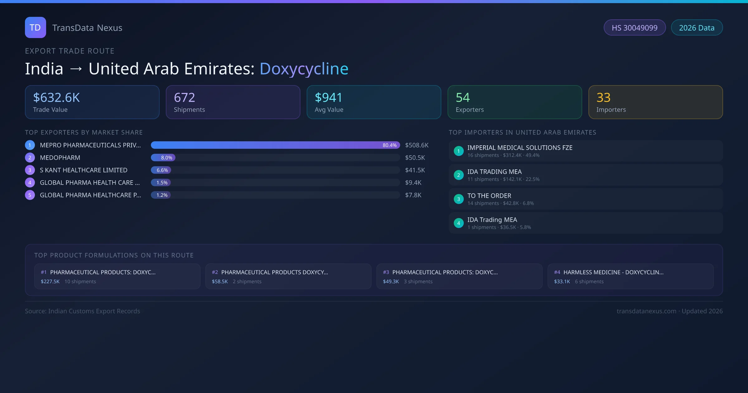India has recorded 672 verified shipments of Doxycycline exported to United Arab Emirates, representing a combined trade value of $632.6K USD. This corridor is served by 54 active Indian exporters, with an average shipment value of $941 USD. The leading Indian exporter is MEPRO PHARMACEUTICALS PRIVATE LIMITED, which accounts for 80% of total export value with 28 shipments worth $508.6K USD. On the buying side, IMPERIAL MEDICAL SOLUTIONS FZE is the largest importer in United Arab Emirates with $312.4K USD in purchases. The top 3 suppliers — MEPRO PHARMACEUTICALS PRIVATE LIMITED, MEDOPHARM, S KANT HEALTHCARE LIMITED — together control 95% of total trade value on this route. All data sourced from Indian Customs (DGFT) shipping bill records. Values reported in FOB USD.