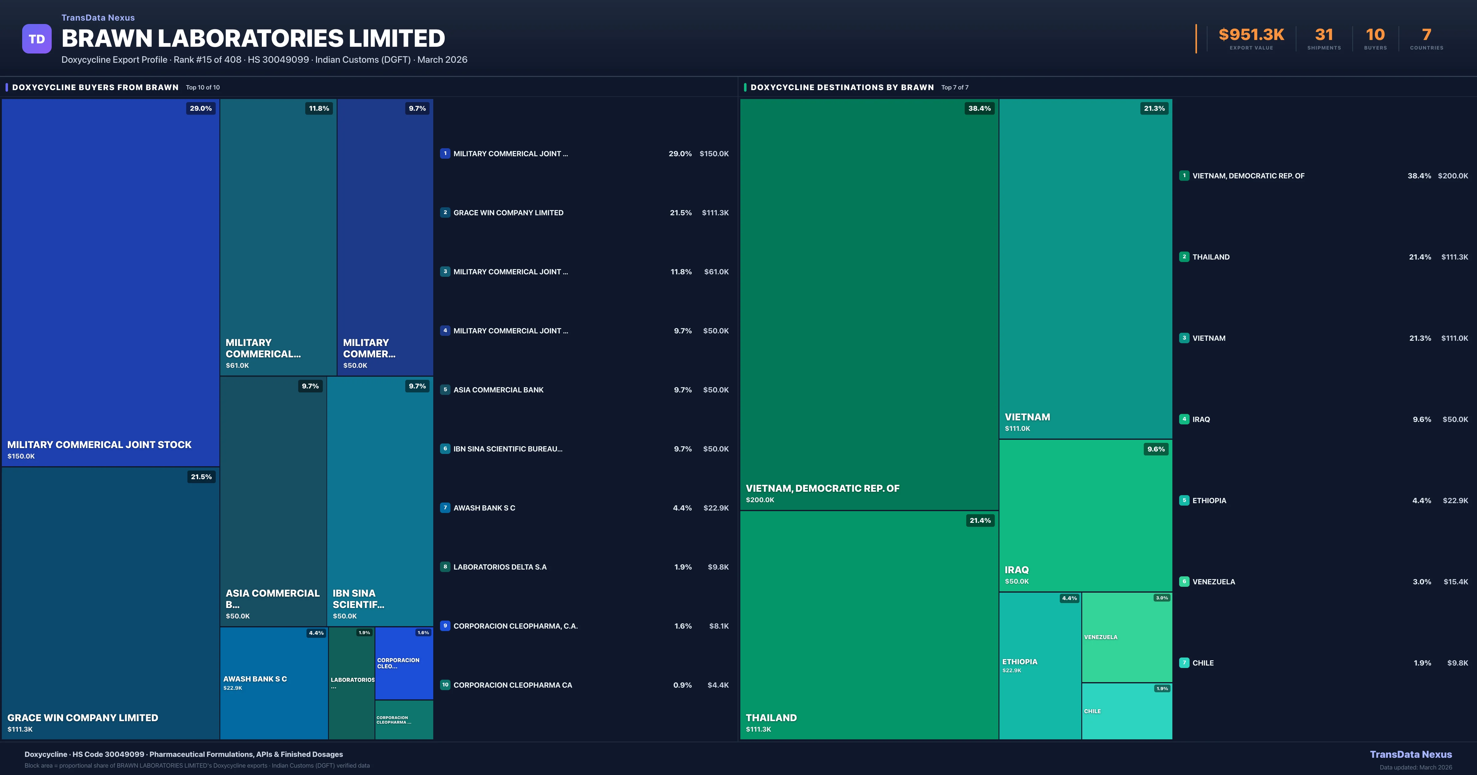 Brawn Laboratories Limited supplies Doxycycline to 10 buyers globally. The largest buyer is MILITARY COMMERICAL JOINT STOCK (VIETNAM, DEMOCRATIC REP. OF), followed by GRACE WIN COMPANY LIMITED (THAILAND) and MILITARY COMMERICAL JOINT STOCK BANK (VIETNAM). These buyers represent pharmaceutical distributors, hospital groups, and government procurement agencies in their respective markets.