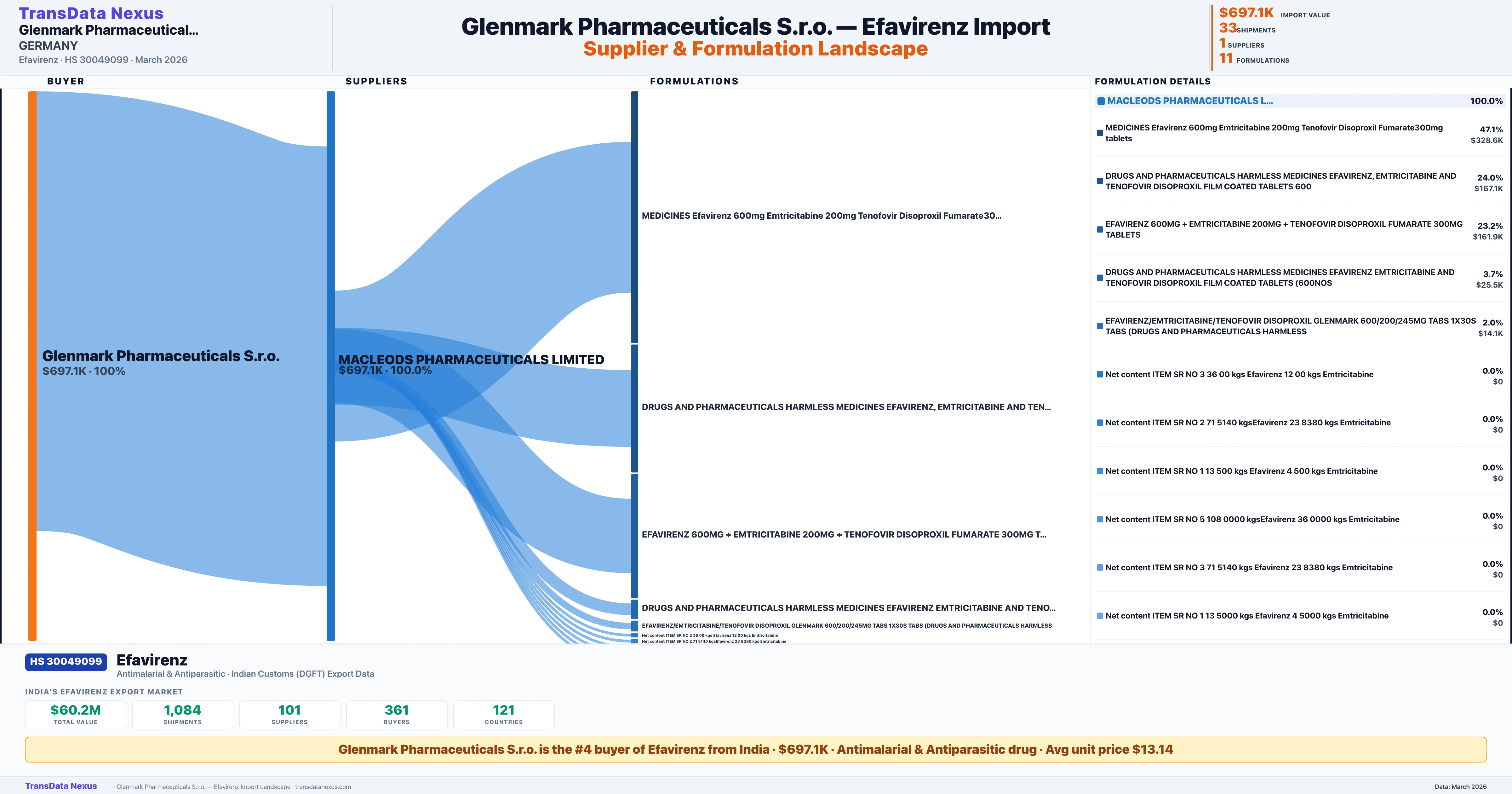 GLENMARK PHARMACEUTICALS S R O sources Efavirenz from 1 verified Indian supplier: MACLEODS PHARMACEUTICALS LIMITED ($697.1K, 100.0%). This is based on 33 customs records.
