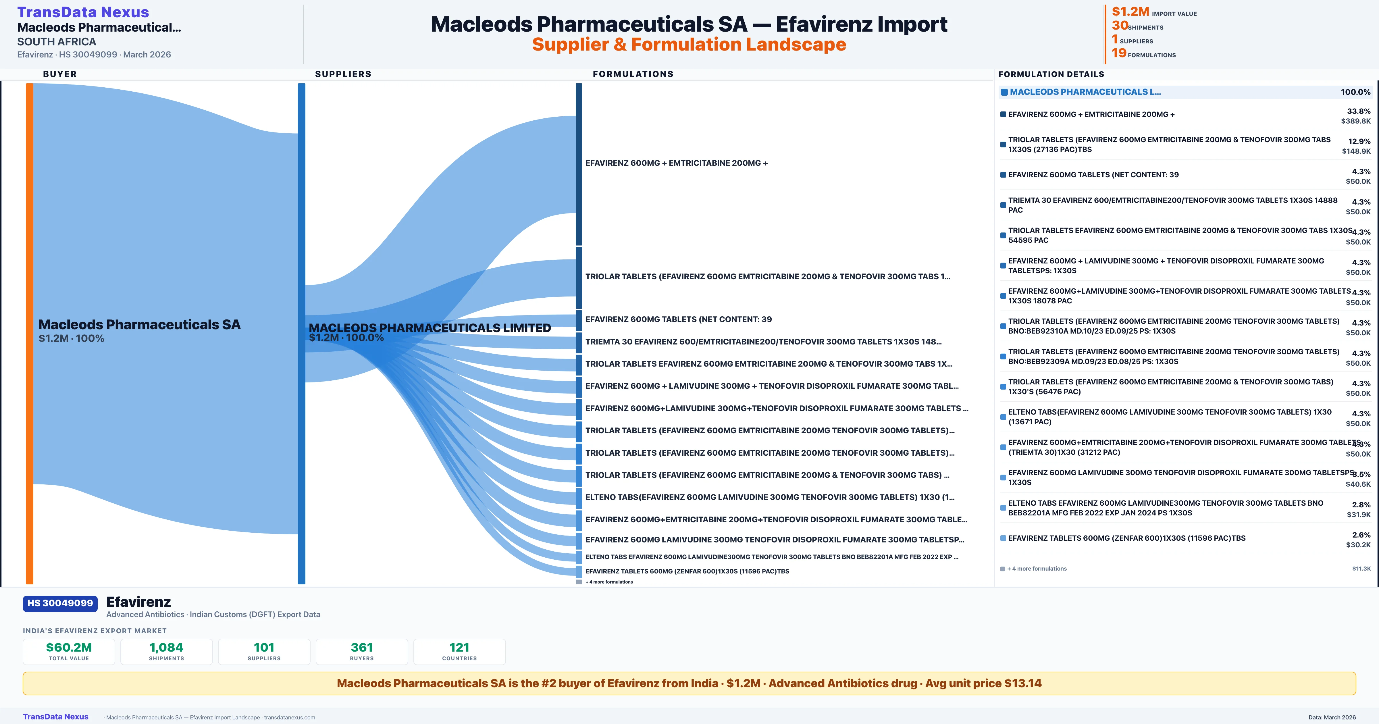 MACLEODS PHARMACEUTICALS SA sources Efavirenz from 1 verified Indian supplier: MACLEODS PHARMACEUTICALS LIMITED ($1.2M, 100.0%). This is based on 30 customs records.
