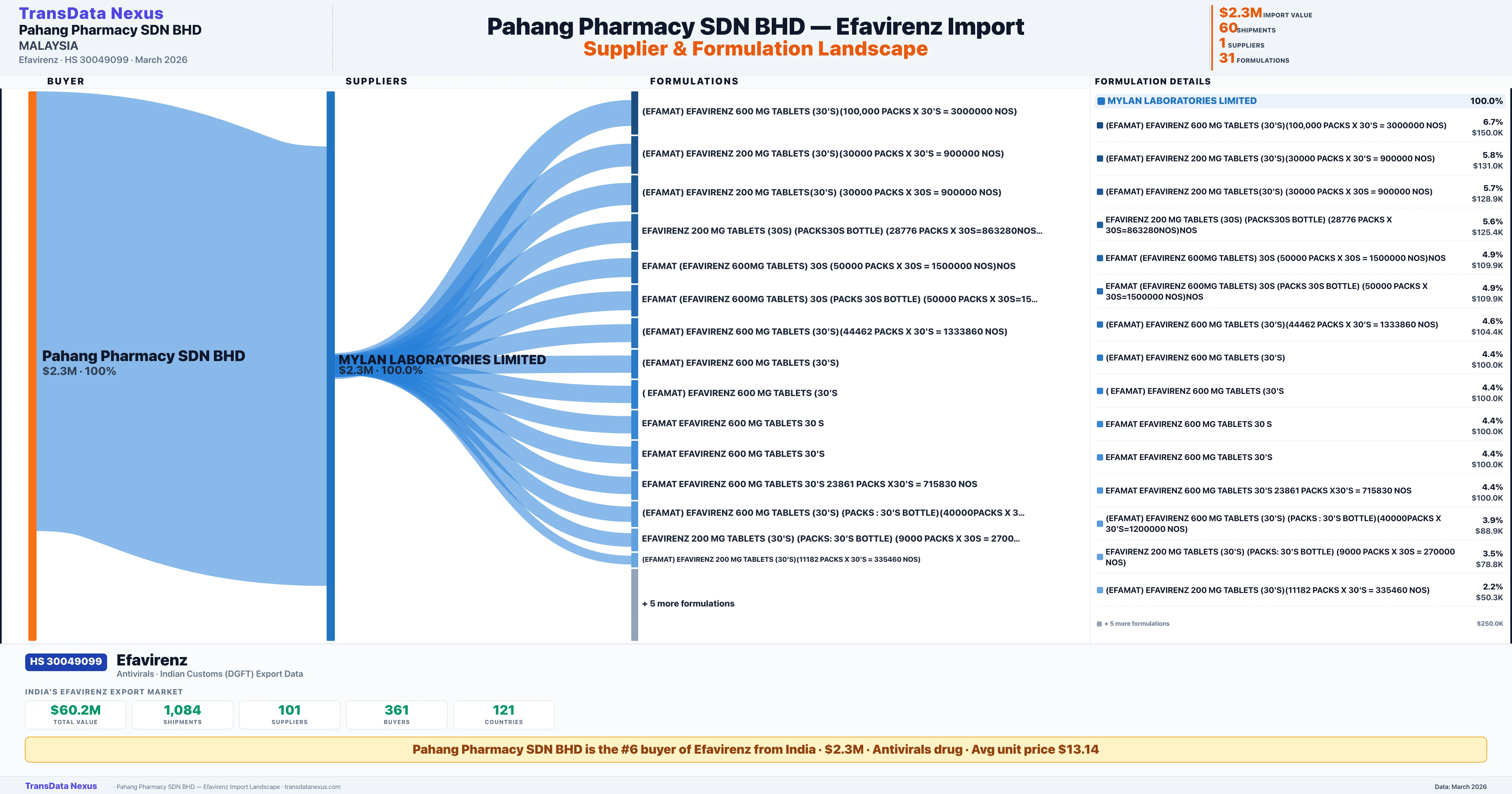 PAHANG PHARMACY SDN BHD, sources Efavirenz from 1 verified Indian supplier based on 60 customs records. The primary supplier is MYLAN LABORATORIES LIMITED accounting for 100.0% of imports.