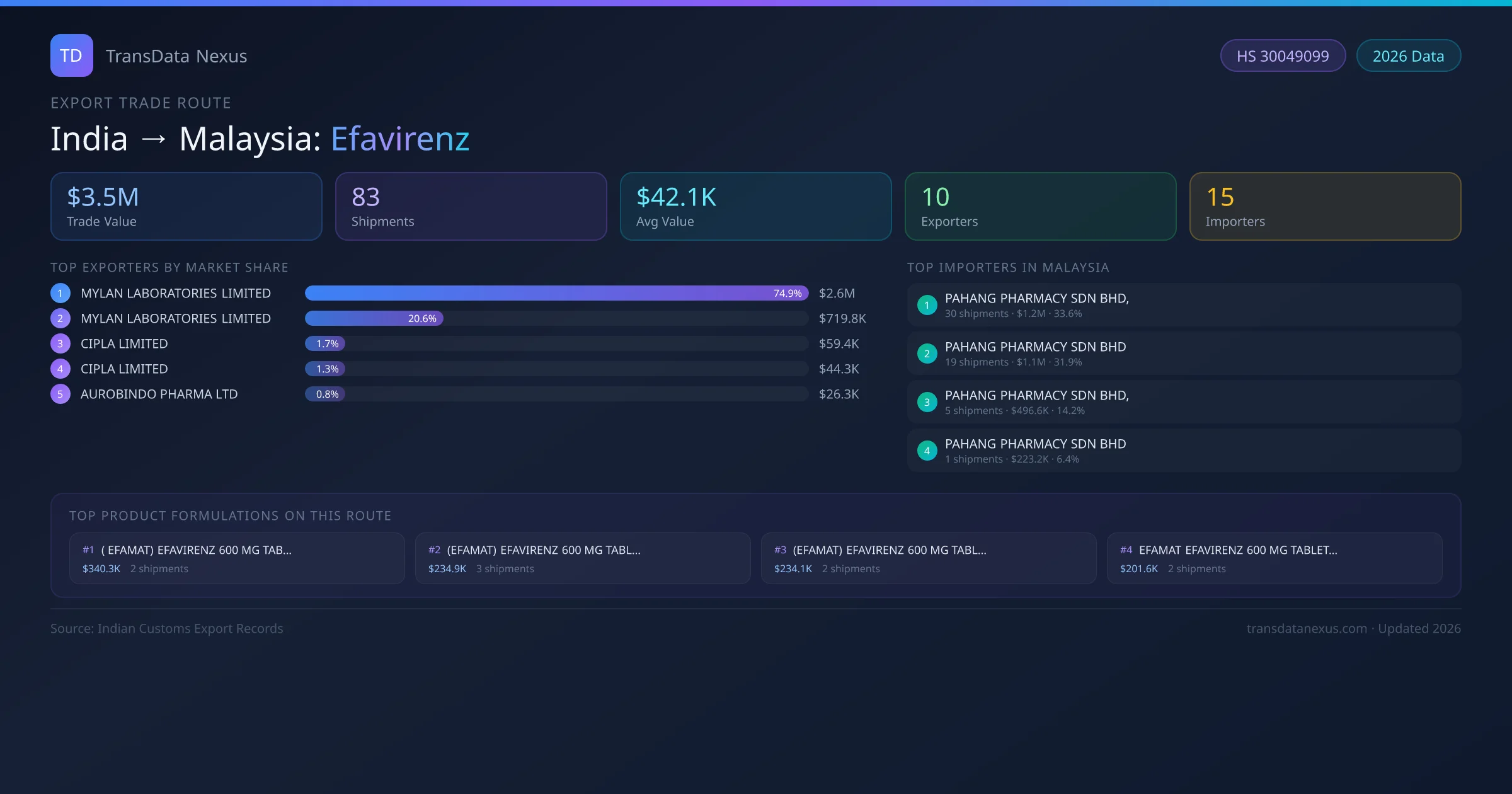 The India to Malaysia Efavirenz corridor is one of India's established pharmaceutical export routes, with 83 shipments documented worth a combined $3.5M USD. The route is dominated by MYLAN LABORATORIES LIMITED, which alone accounts for roughly 75% of all export value, reflecting the consolidated nature of India's efavirenz manufacturing sector.