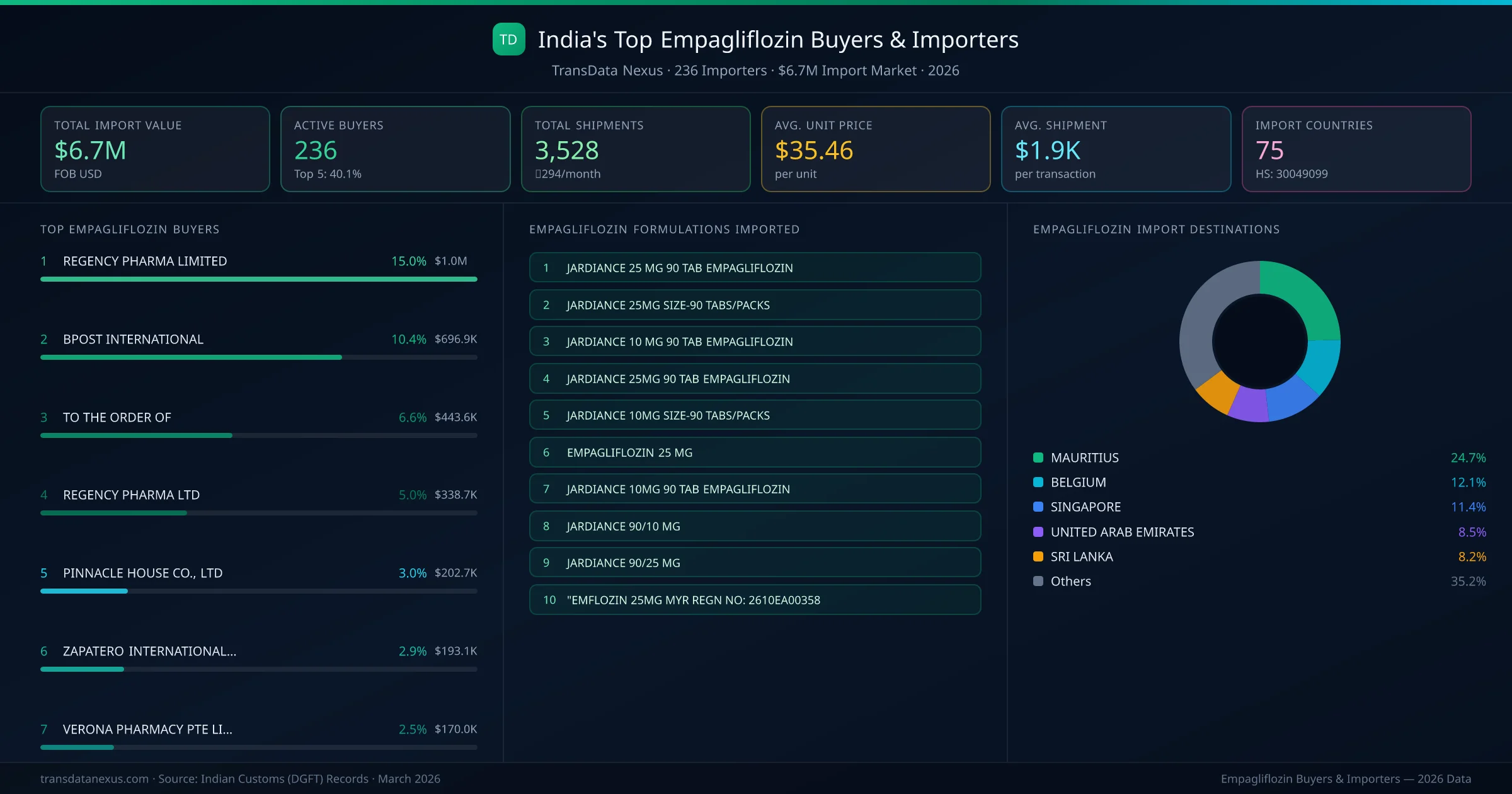 REGENCY PHARMA LIMITED (MAURITIUS) is the leading empagliflozin importer from India, holding a 15.0% share of the $6.7M market across 3,528 shipments from 236 buyers. The top 5 buyers — REGENCY PHARMA LIMITED (MAURITIUS), BPOST INTERNATIONAL (BELGIUM), REGENCY PHARMA LTD (MAURITIUS), PINNACLE HOUSE CO., LTD (THAILAND), ZAPATERO INTERNATIONAL LTD (MAURITIUS) — collectively control 36.4% of total import value.