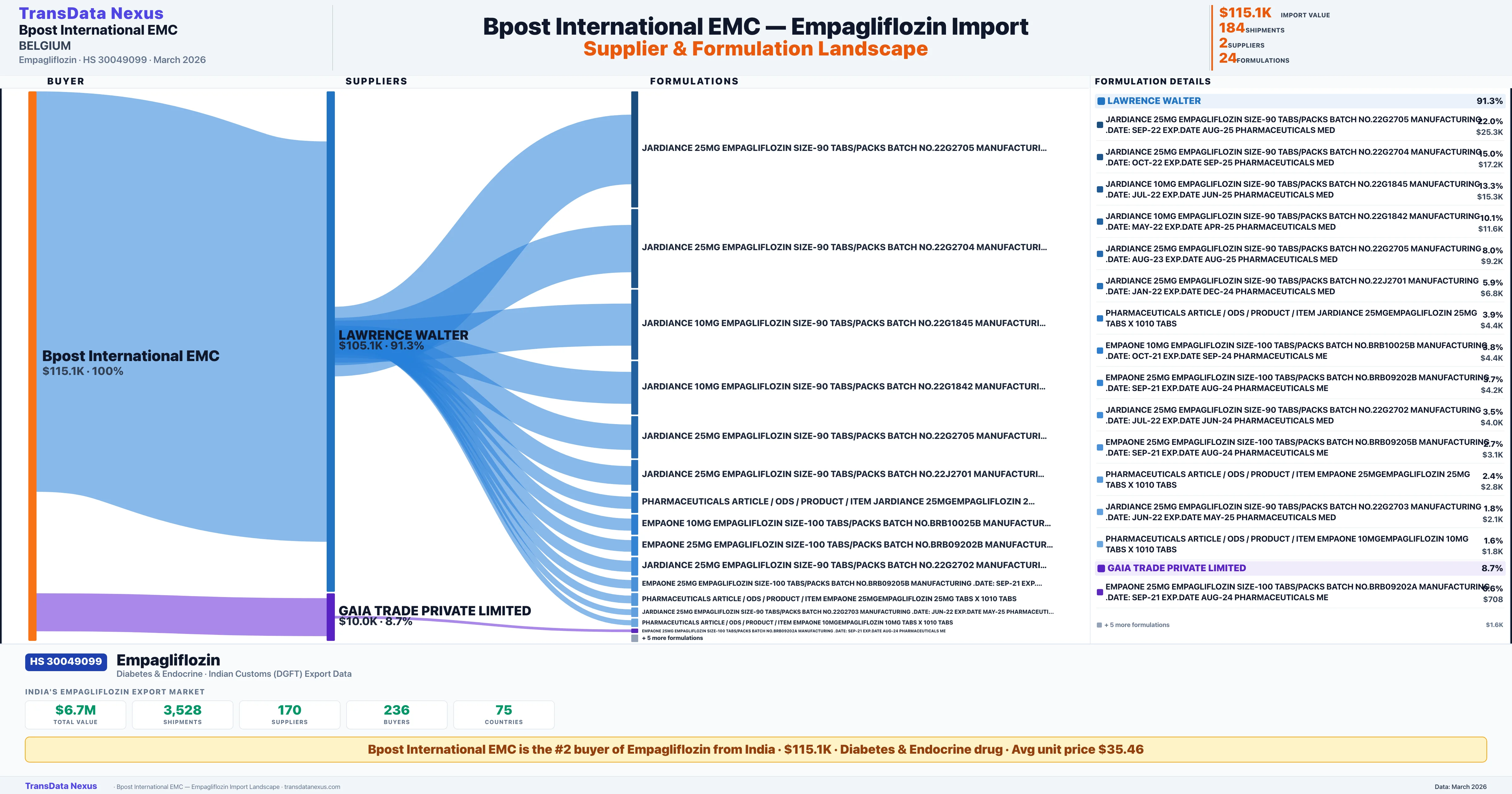 BPOST INTERNATIONAL EMC sources Empagliflozin from 2 verified Indian suppliers: LAWRENCE WALTER ($105.1K, 91.3%), GAIA TRADE PRIVATE LIMITED ($10.0K, 8.7%). This is based on 184 customs records.