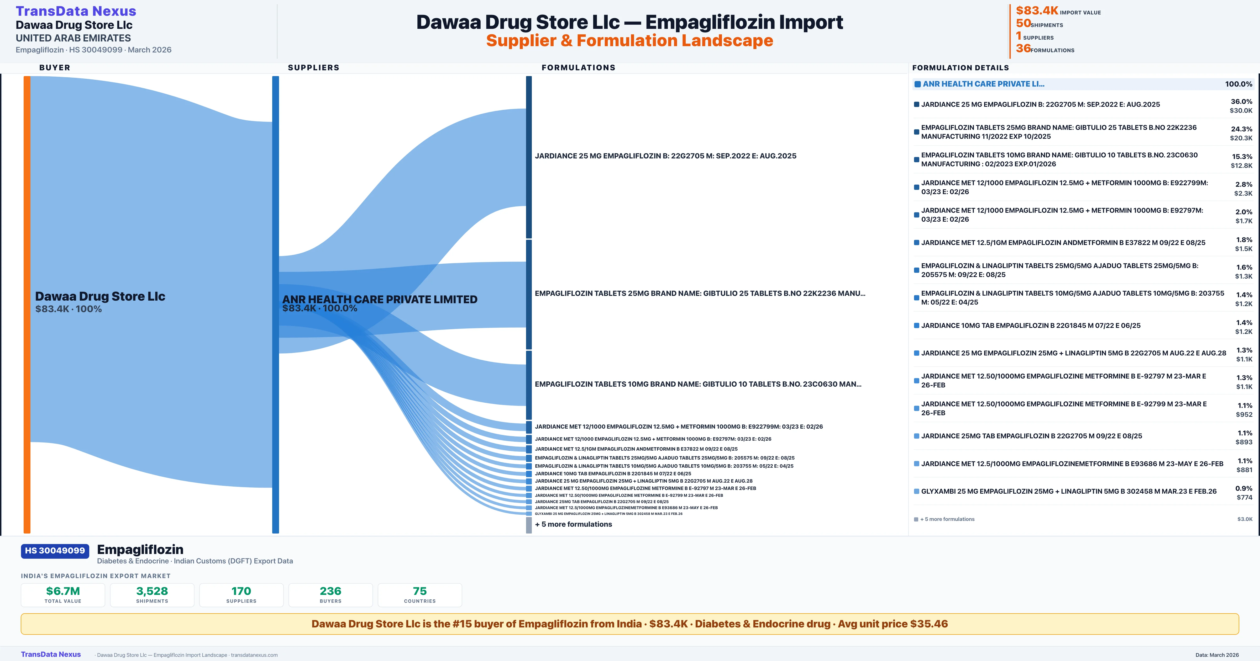 DAWAA DRUG STORE LLC sources Empagliflozin from 1 verified Indian supplier based on 50 customs records. The primary supplier is ANR HEALTH CARE PRIVATE LIMITED accounting for 100.0% of imports.