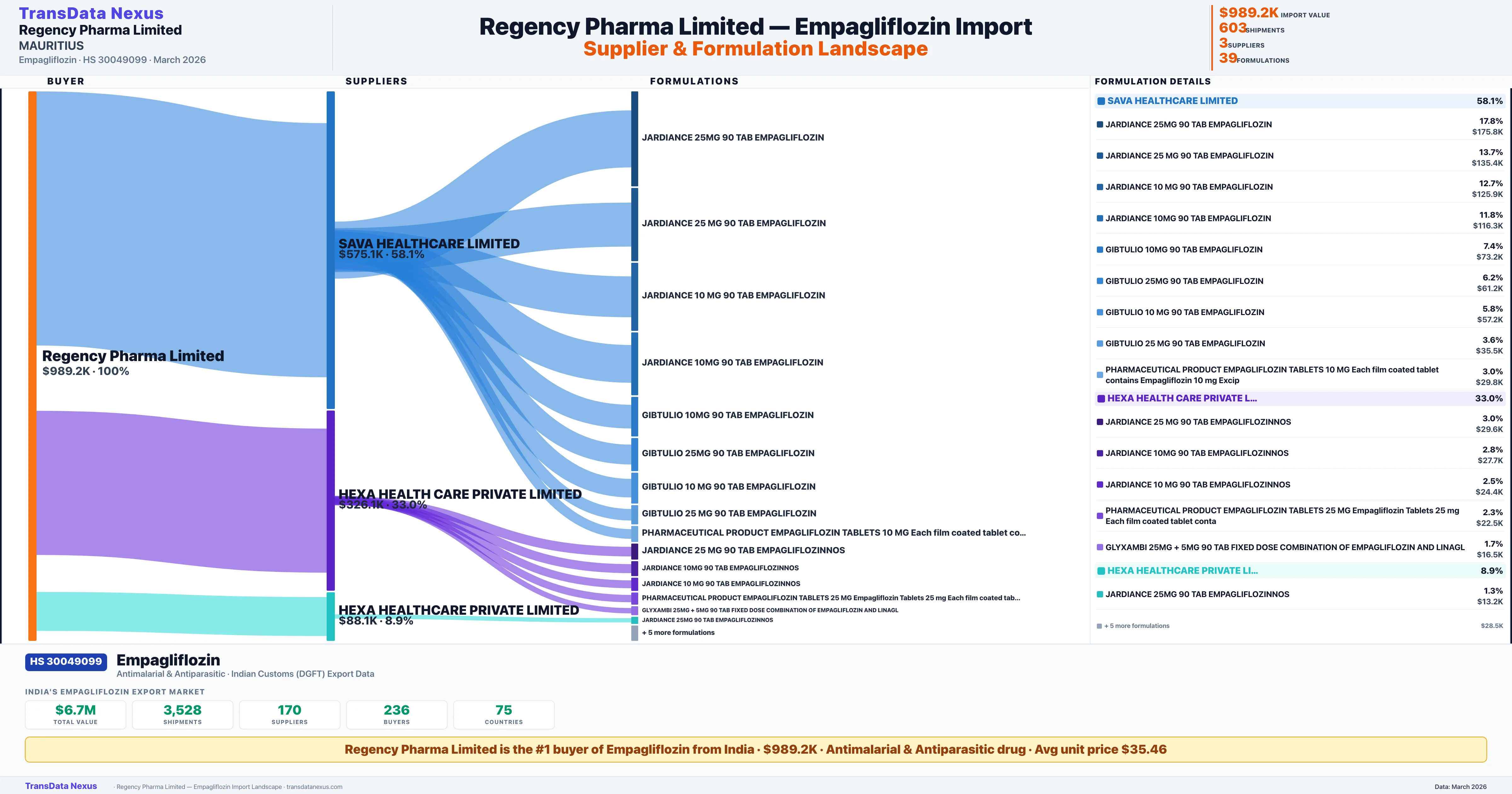REGENCY PHARMA LIMITED sources Empagliflozin from 3 verified Indian suppliers: SAVA HEALTHCARE LIMITED ($575.1K, 58.1%), HEXA HEALTH CARE PRIVATE LIMITED ($326.1K, 33.0%), HEXA HEALTHCARE PRIVATE LIMITED ($88.1K, 8.9%). This is based on 603 customs records.