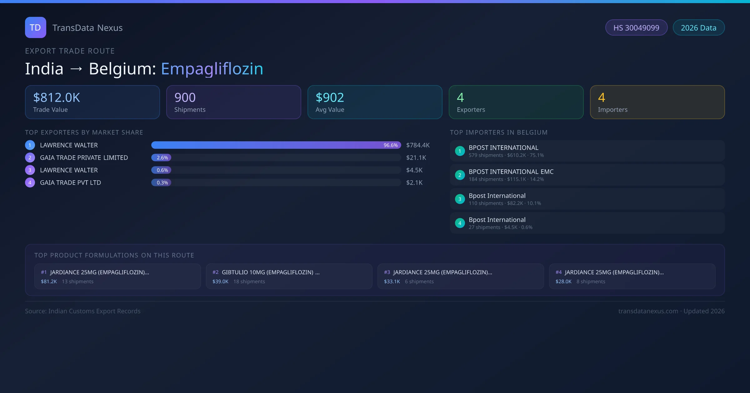 India has recorded 900 verified shipments of Empagliflozin exported to Belgium, representing a combined trade value of $812.0K USD. This corridor is served by 4 active Indian exporters, with an average shipment value of $902 USD. The leading Indian exporter is LAWRENCE WALTER, which accounts for 97% of total export value with 749 shipments worth $784.4K USD. On the buying side, BPOST INTERNATIONAL is the largest importer in Belgium with $610.2K USD in purchases. The top 3 suppliers — LAWRENCE WALTER, GAIA TRADE PRIVATE LIMITED, LAWRENCE WALTER — together control 100% of total trade value on this route. All data sourced from Indian Customs (DGFT) shipping bill records. Values reported in FOB USD.