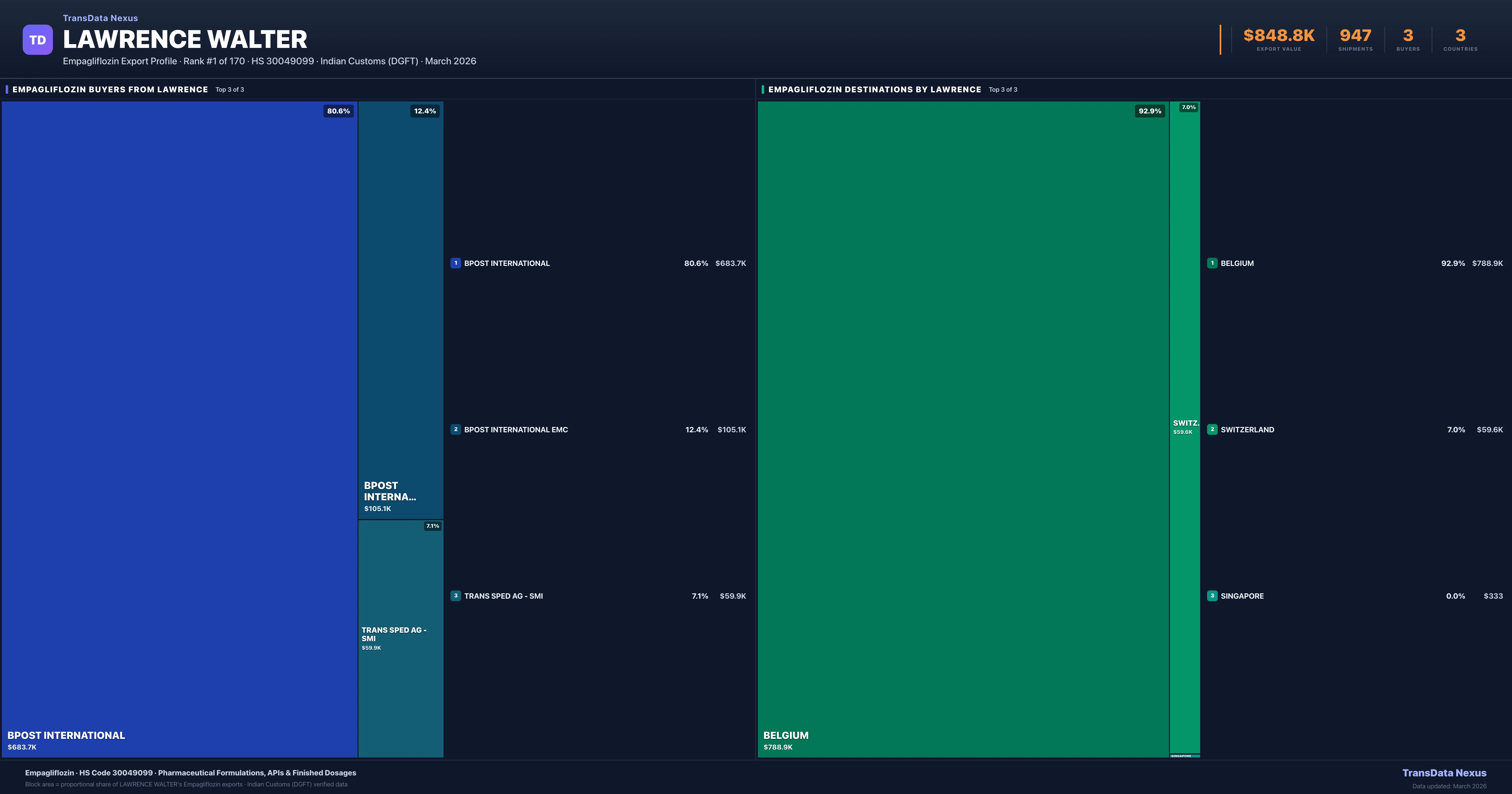 Lawrence Walter ranks #1 among 170 Indian Empagliflozin exporters with a 12.7% market share. The top 3 exporters are LAWRENCE WALTER ($848.8K), BOEHRINGER INGELHEIM INDIA PRIVATE LIMITED ($681.8K), HEXA HEALTH CARE PRIVATE LIMITED ($675.4K). Lawrence Walter processed 947 shipments to 3 destination countries.