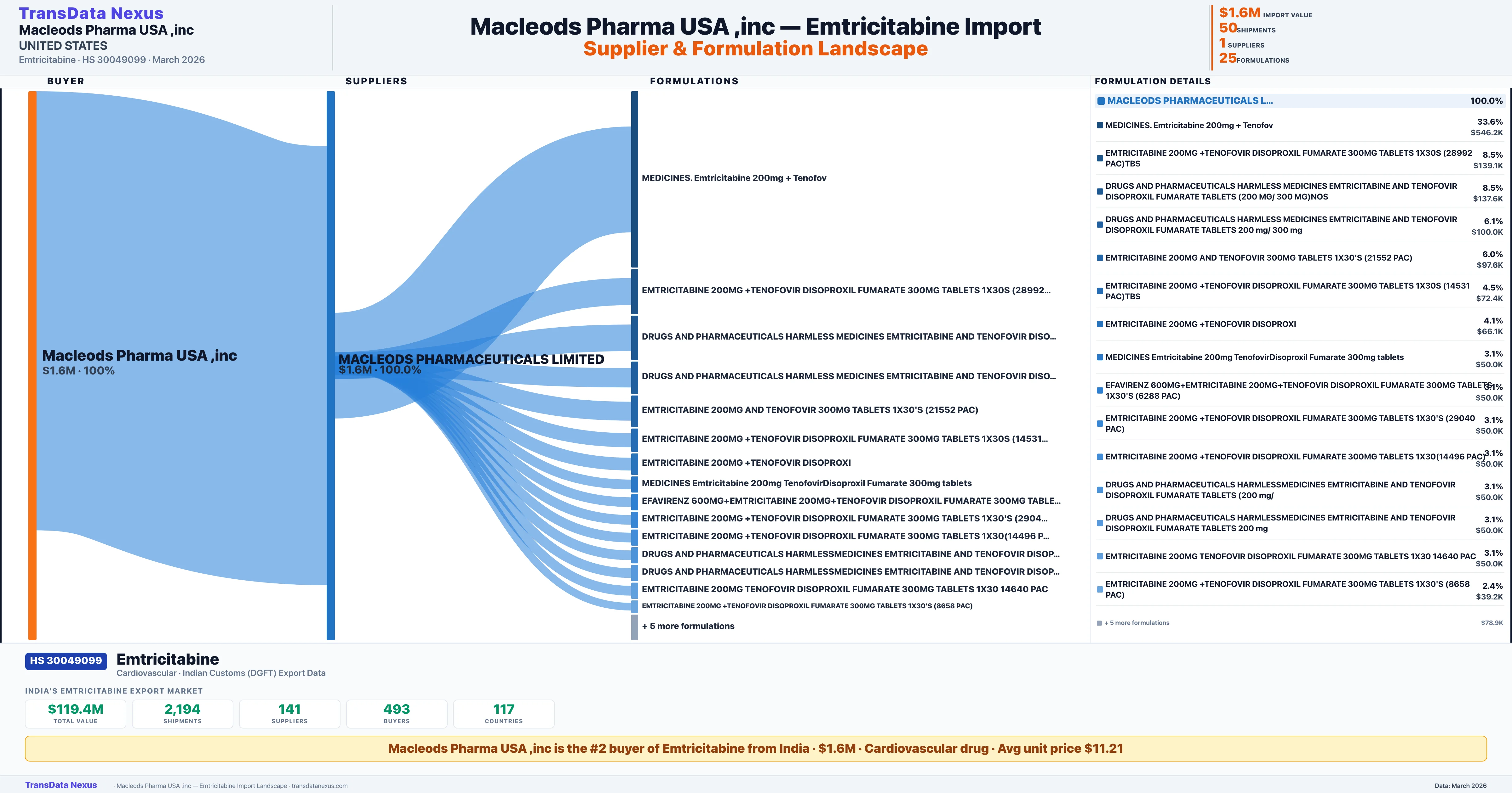 MACLEODS PHARMA USA INC sources Emtricitabine from 1 verified Indian supplier: MACLEODS PHARMACEUTICALS LIMITED ($1.6M, 100.0%). This is based on 50 customs records.