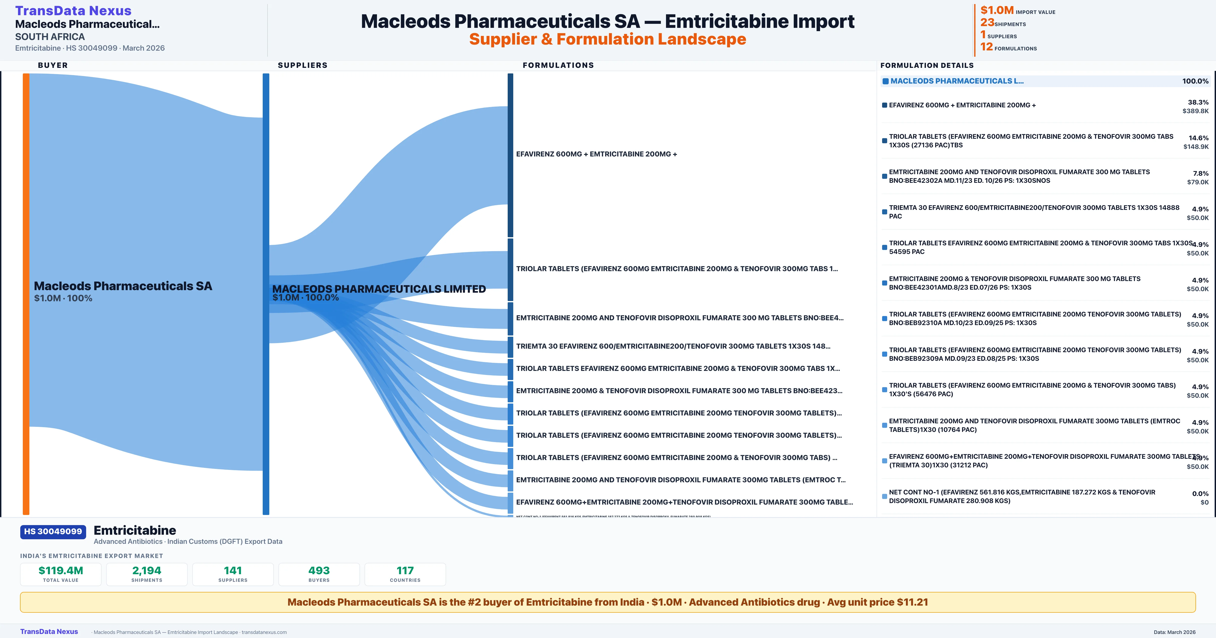 MACLEODS PHARMACEUTICALS SA sources Emtricitabine from 1 verified Indian supplier: MACLEODS PHARMACEUTICALS LIMITED ($1.0M, 100.0%). This is based on 23 customs records.