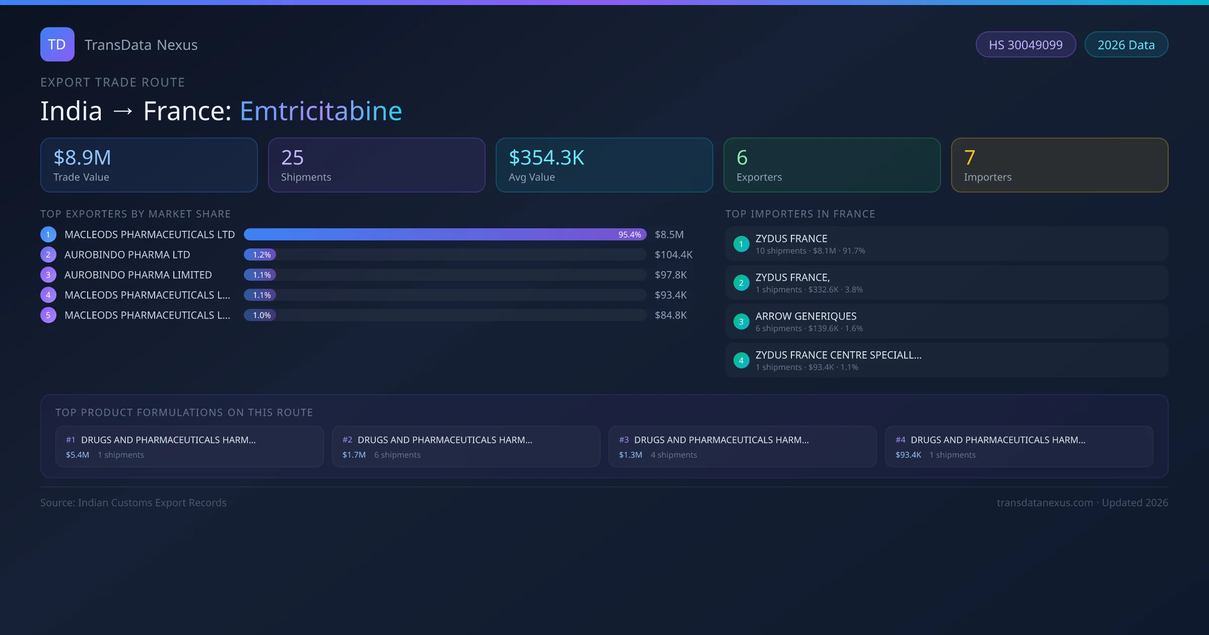 India has recorded 25 verified shipments of Emtricitabine exported to France, representing a combined trade value of $8.9M USD. This corridor is served by 6 active Indian exporters, with an average shipment value of $354.3K USD. The leading Indian exporter is MACLEODS PHARMACEUTICALS LTD, which accounts for 95% of total export value with 11 shipments worth $8.5M USD. On the buying side, ZYDUS FRANCE is the largest importer in France with $8.1M USD in purchases. The top 3 suppliers — MACLEODS PHARMACEUTICALS LTD, AUROBINDO PHARMA LTD, AUROBINDO PHARMA LIMITED — together control 98% of total trade value on this route. All data sourced from Indian Customs (DGFT) shipping bill records. Values reported in FOB USD.