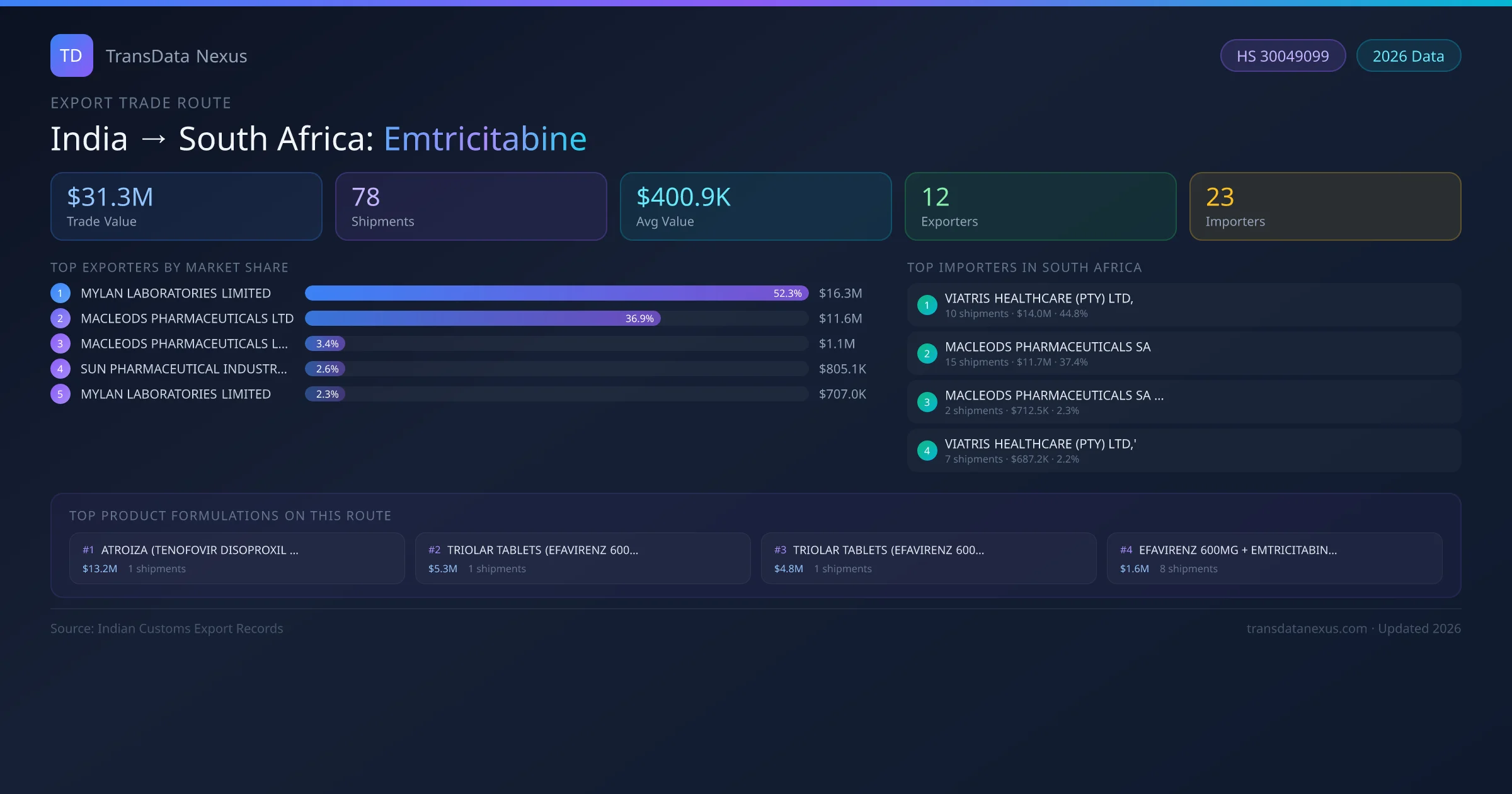 India has recorded 78 verified shipments of Emtricitabine exported to South Africa, representing a combined trade value of $31.3M USD. This corridor is served by 12 active Indian exporters, with an average shipment value of $400.9K USD. The leading Indian exporter is MYLAN LABORATORIES LIMITED, which accounts for 52% of total export value with 35 shipments worth $16.3M USD. On the buying side, VIATRIS HEALTHCARE (PTY) LTD, is the largest importer in South Africa with $14.0M USD in purchases. The top 3 suppliers β MYLAN LABORATORIES LIMITED, MACLEODS PHARMACEUTICALS LTD, MACLEODS PHARMACEUTICALS LTD β together control 93% of total trade value on this route. All data sourced from Indian Customs (DGFT) shipping bill records. Values reported in FOB USD.