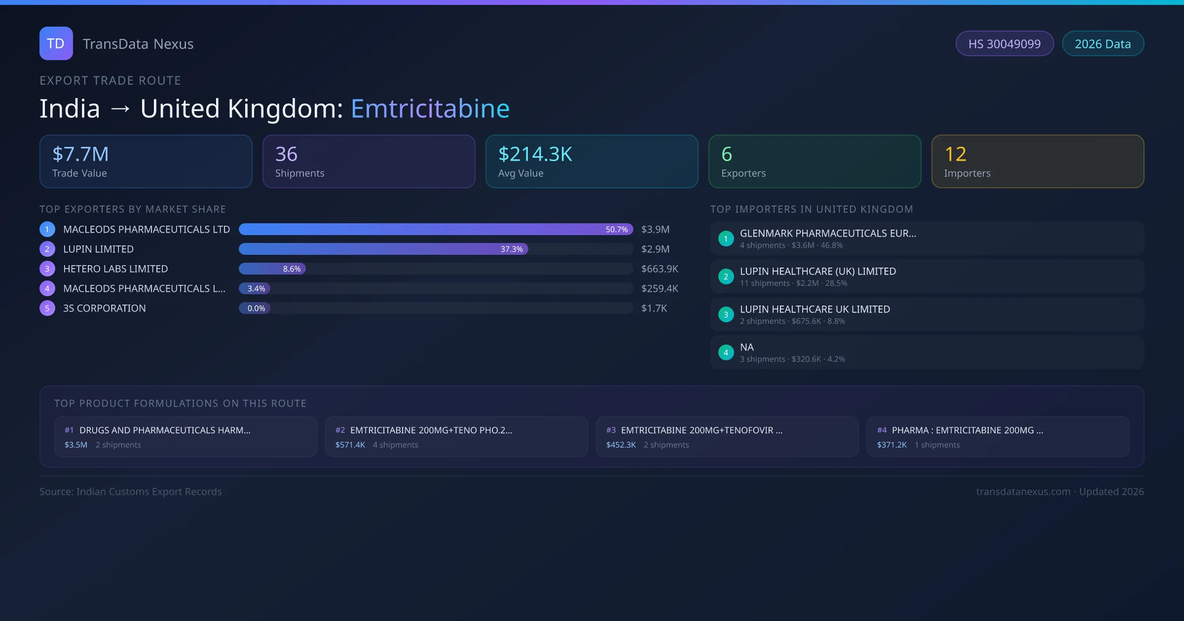 India has recorded 36 verified shipments of Emtricitabine exported to United Kingdom, representing a combined trade value of $7.7M USD. This corridor is served by 6 active Indian exporters, with an average shipment value of $214.3K USD. The leading Indian exporter is MACLEODS PHARMACEUTICALS LTD, which accounts for 51% of total export value with 8 shipments worth $3.9M USD. On the buying side, GLENMARK PHARMACEUTICALS EUROPE LTD is the largest importer in United Kingdom with $3.6M USD in purchases. The top 3 suppliers — MACLEODS PHARMACEUTICALS LTD, LUPIN LIMITED, HETERO LABS LIMITED — together control 97% of total trade value on this route. All data sourced from Indian Customs (DGFT) shipping bill records. Values reported in FOB USD.
