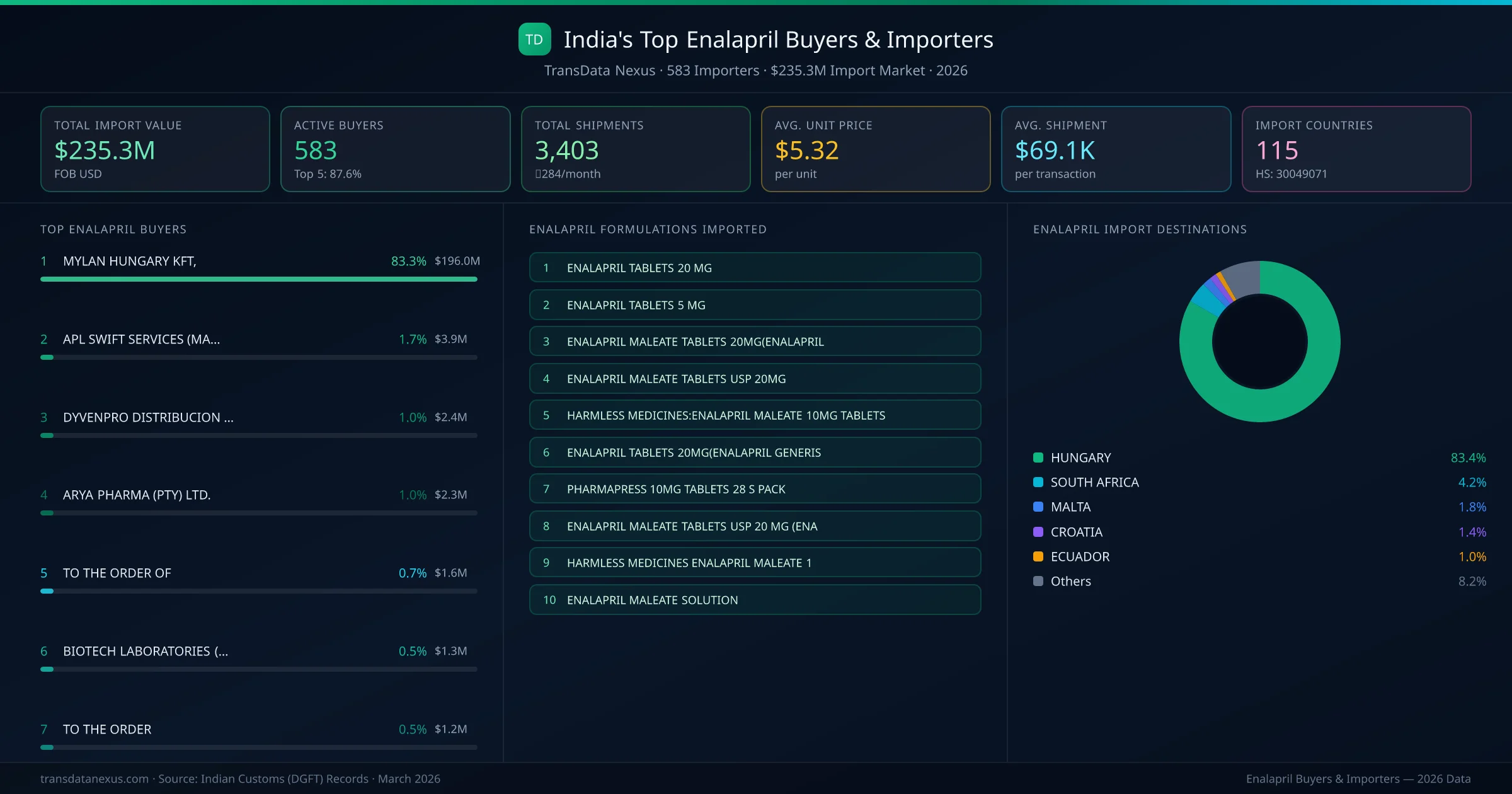 MYLAN HUNGARY KFT, (HUNGARY) is the leading enalapril importer from India, holding a 83.3% share of the $235.3M market across 3,403 shipments from 583 buyers. The top 5 buyers โ MYLAN HUNGARY KFT, (HUNGARY), APL SWIFT SERVICES (MALTA) LTD., (MALTA), DYVENPRO DISTRIBUCION Y VENTA DE (ECUADOR), ARYA PHARMA (PTY) LTD. (SOUTH AFRICA), BIOTECH LABORATORIES (PTY) LTD (SOUTH AFRICA) โ collectively control 87.5% of total import value.