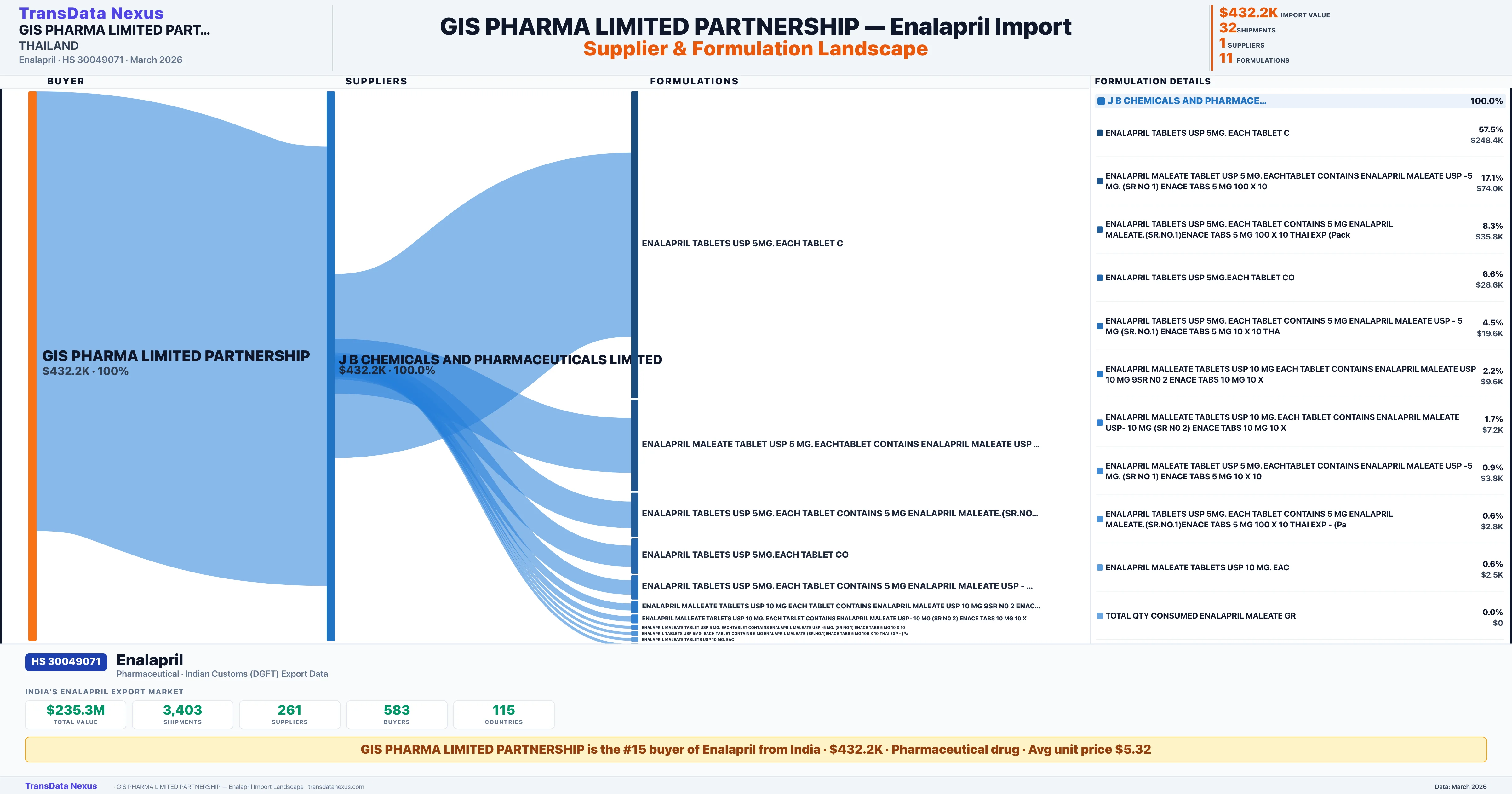 GIS PHARMA LIMITED PARTNERSHIP sources Enalapril from 1 verified Indian supplier: J B CHEMICALS AND PHARMACEUTICALS LIMITED ($432.2K, 100.0%). This is based on 32 customs records.