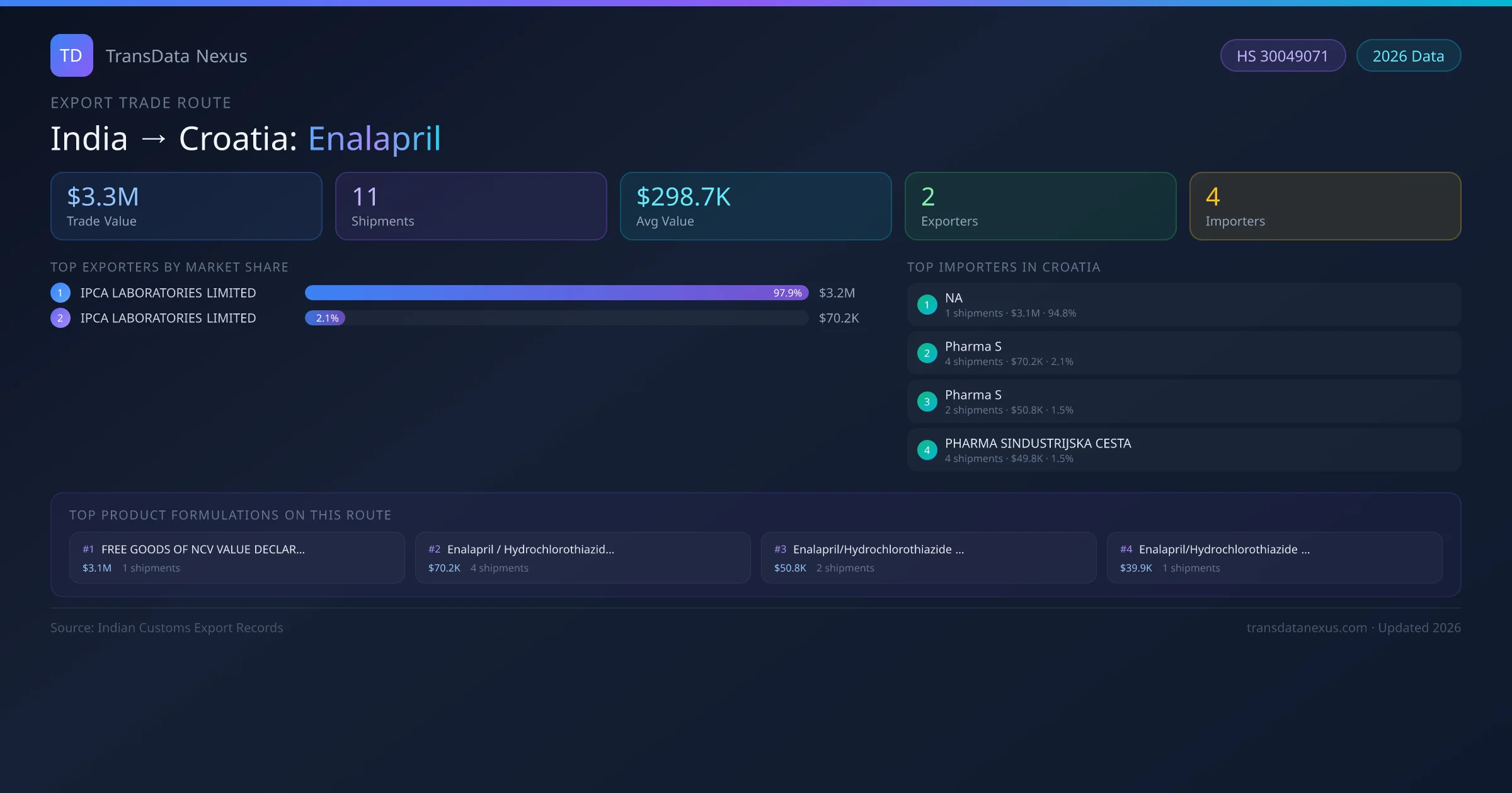 India has recorded 11 verified shipments of Enalapril exported to Croatia, representing a combined trade value of $3.3M USD. This corridor is served by 2 active Indian exporters, with an average shipment value of $298.7K USD. The leading Indian exporter is IPCA LABORATORIES LIMITED, which accounts for 98% of total export value with 7 shipments worth $3.2M USD. On the buying side, NA is the largest importer in Croatia with $3.1M USD in purchases. All data sourced from Indian Customs (DGFT) shipping bill records. Values reported in FOB USD.