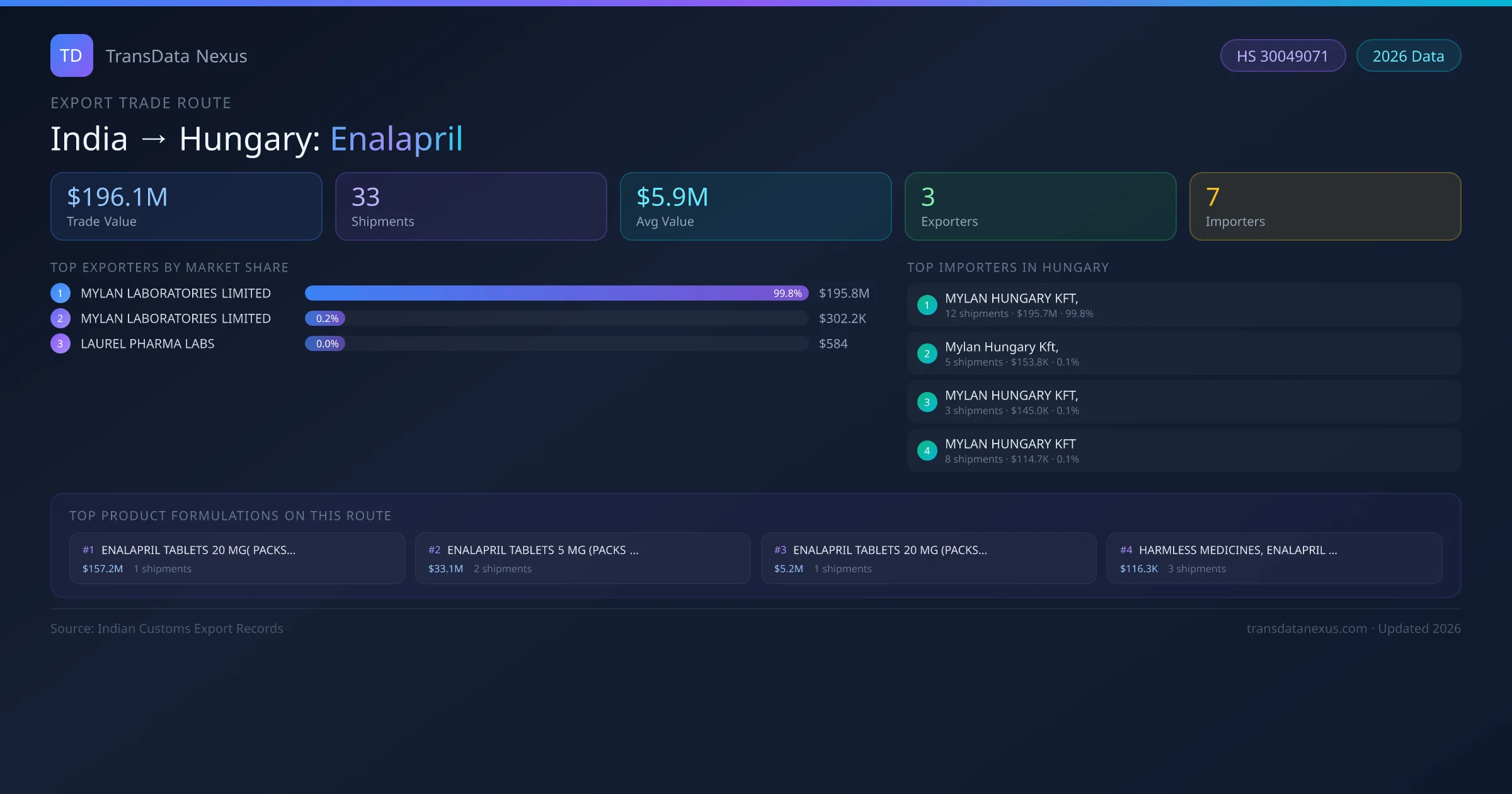India has recorded 33 verified shipments of Enalapril exported to Hungary, representing a combined trade value of $196.1M USD. This corridor is served by 3 active Indian exporters, with an average shipment value of $5.9M USD. The leading Indian exporter is MYLAN LABORATORIES LIMITED, which accounts for 100% of total export value with 23 shipments worth $195.8M USD. On the buying side, MYLAN HUNGARY KFT, is the largest importer in Hungary with $195.7M USD in purchases. The top 3 suppliers — MYLAN LABORATORIES LIMITED, MYLAN LABORATORIES LIMITED , LAUREL PHARMA LABS — together control 100% of total trade value on this route. All data sourced from Indian Customs (DGFT) shipping bill records. Values reported in FOB USD.