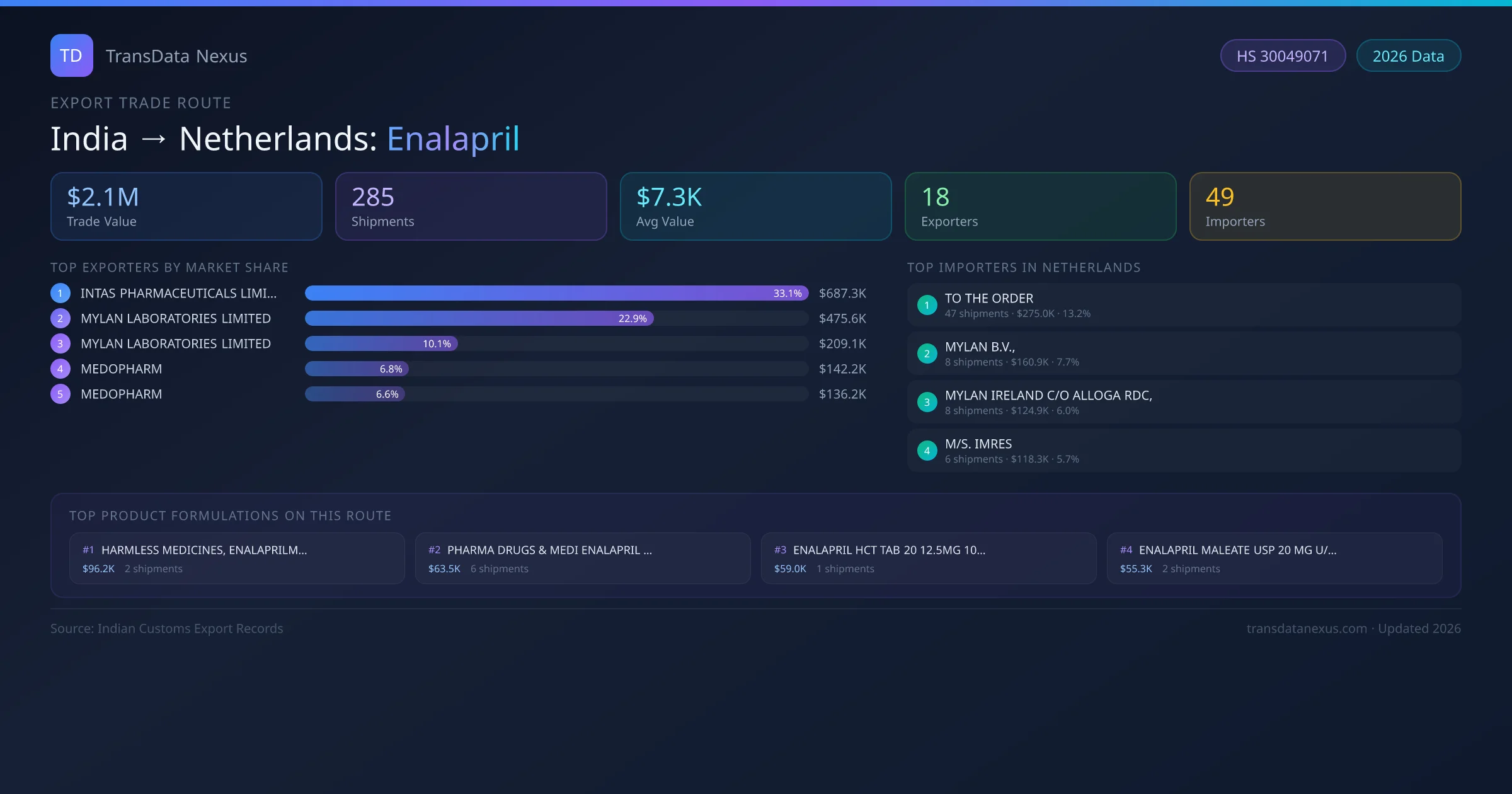 India has recorded 285 verified shipments of Enalapril exported to Netherlands, representing a combined trade value of $2.1M USD. This corridor is served by 18 active Indian exporters, with an average shipment value of $7.3K USD. The leading Indian exporter is INTAS PHARMACEUTICALS LIMITED, which accounts for 33% of total export value with 172 shipments worth $687.3K USD. On the buying side, TO THE ORDER is the largest importer in Netherlands with $275.0K USD in purchases. The top 3 suppliers — INTAS PHARMACEUTICALS LIMITED, MYLAN LABORATORIES LIMITED, MYLAN LABORATORIES LIMITED — together control 66% of total trade value on this route. All data sourced from Indian Customs (DGFT) shipping bill records. Values reported in FOB USD.