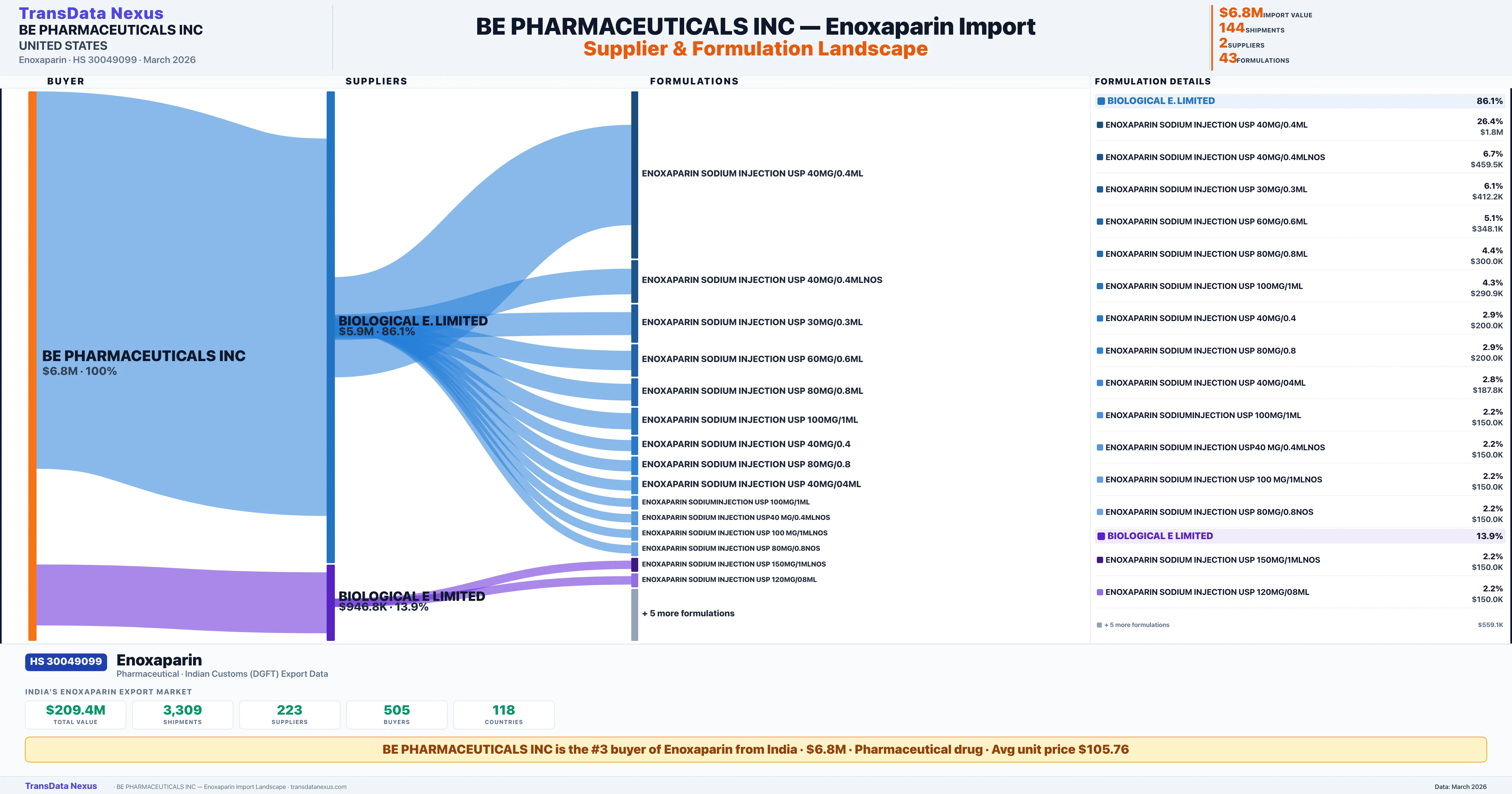 BE PHARMACEUTICALS INC sources Enoxaparin from 2 verified Indian suppliers: BIOLOGICAL E. LIMITED ($5.9M, 86.1%), BIOLOGICAL E LIMITED ($946.8K, 13.9%). This is based on 144 customs records.