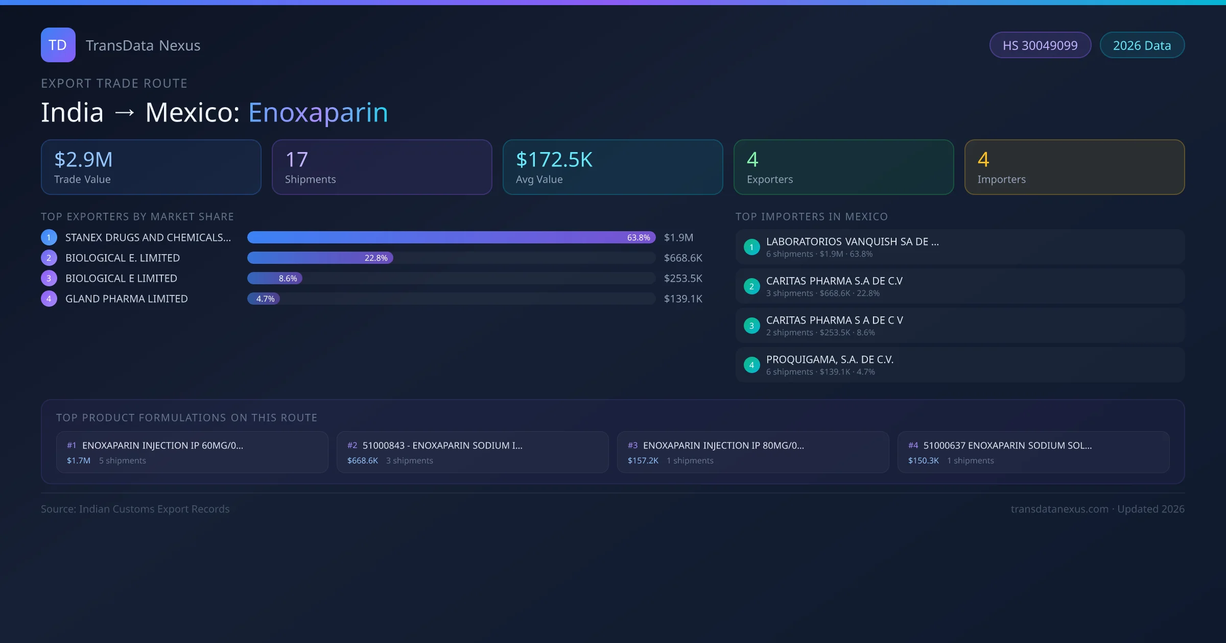India exports Enoxaparin to Mexico worth approximately $2.9M USD across 17 recorded shipments. The average value per shipment is $172.5K USD.