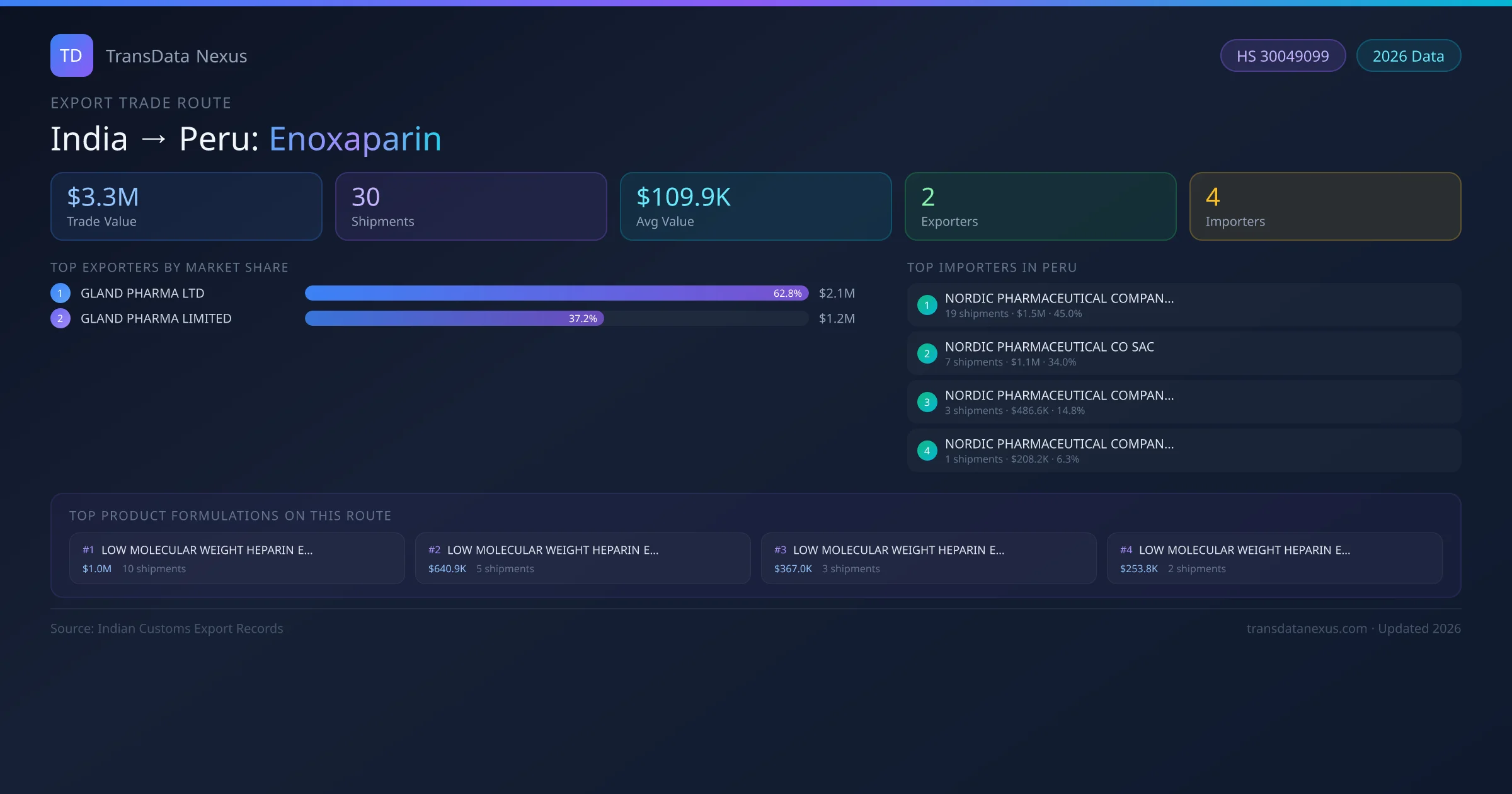 India exports Enoxaparin to Peru worth approximately $3.3M USD across 30 recorded shipments. The average value per shipment is $109.9K USD.