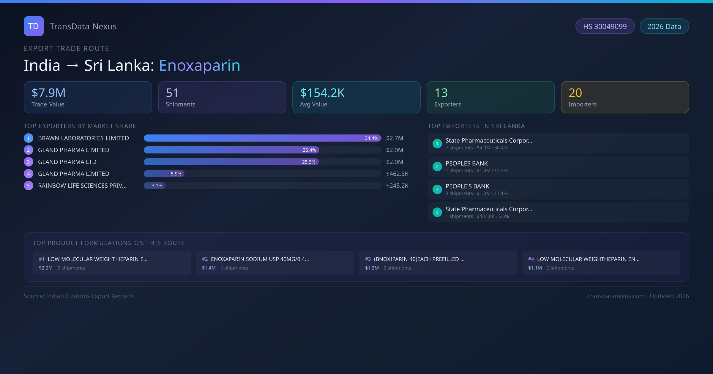 - 1.Route Identification: India to Sri Lanka export trade corridor identified from Indian Customs (DGFT) records for Enoxaparin.