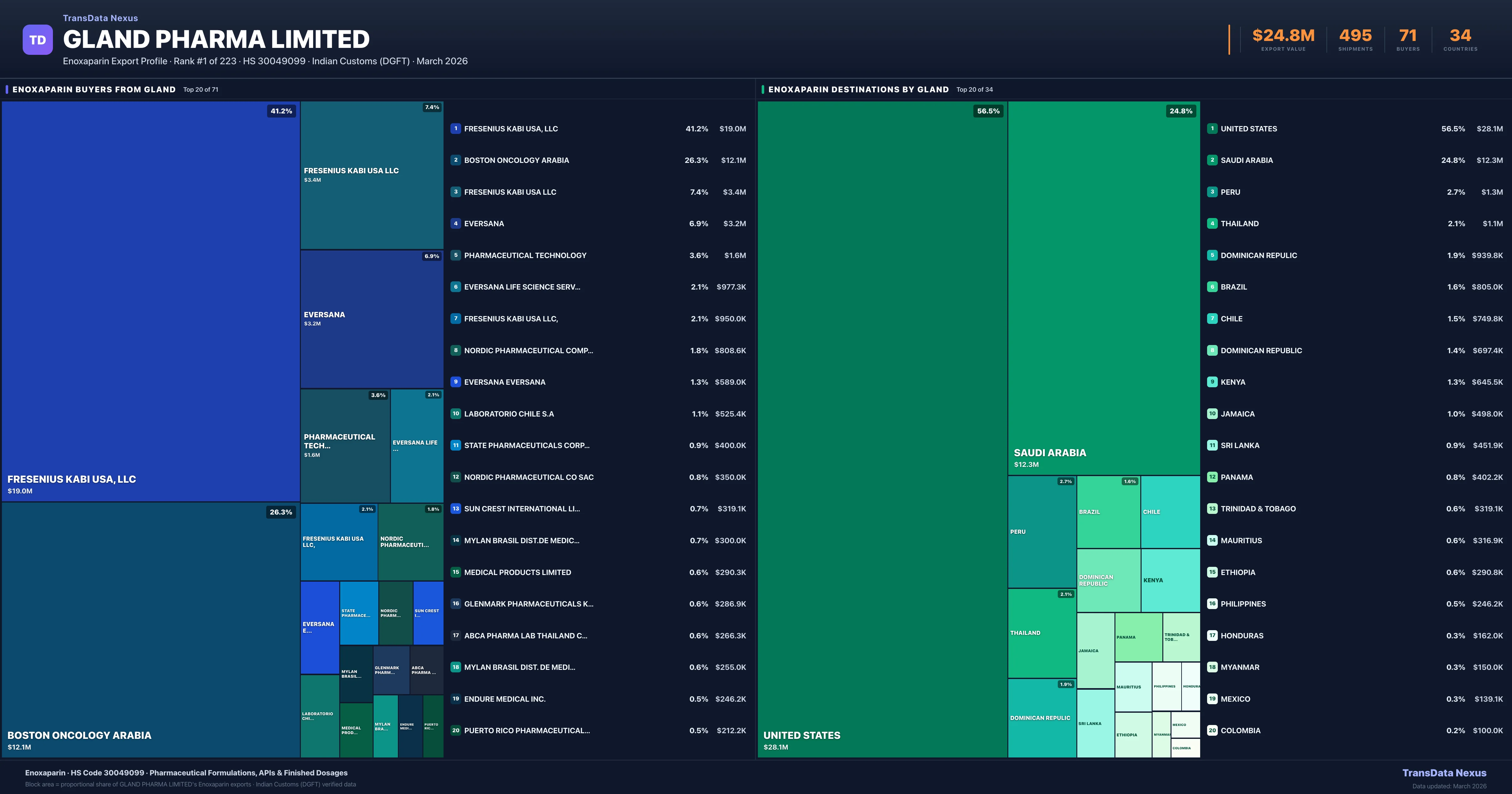 Gland Pharma Limited supplies Enoxaparin to 71 buyers globally. The largest buyer is FRESENIUS KABI USA, LLC (UNITED STATES), followed by BOSTON ONCOLOGY ARABIA (SAUDI ARABIA) and FRESENIUS KABI USA LLC (UNITED STATES). These buyers represent pharmaceutical distributors, hospital groups, and government procurement agencies in their respective markets.