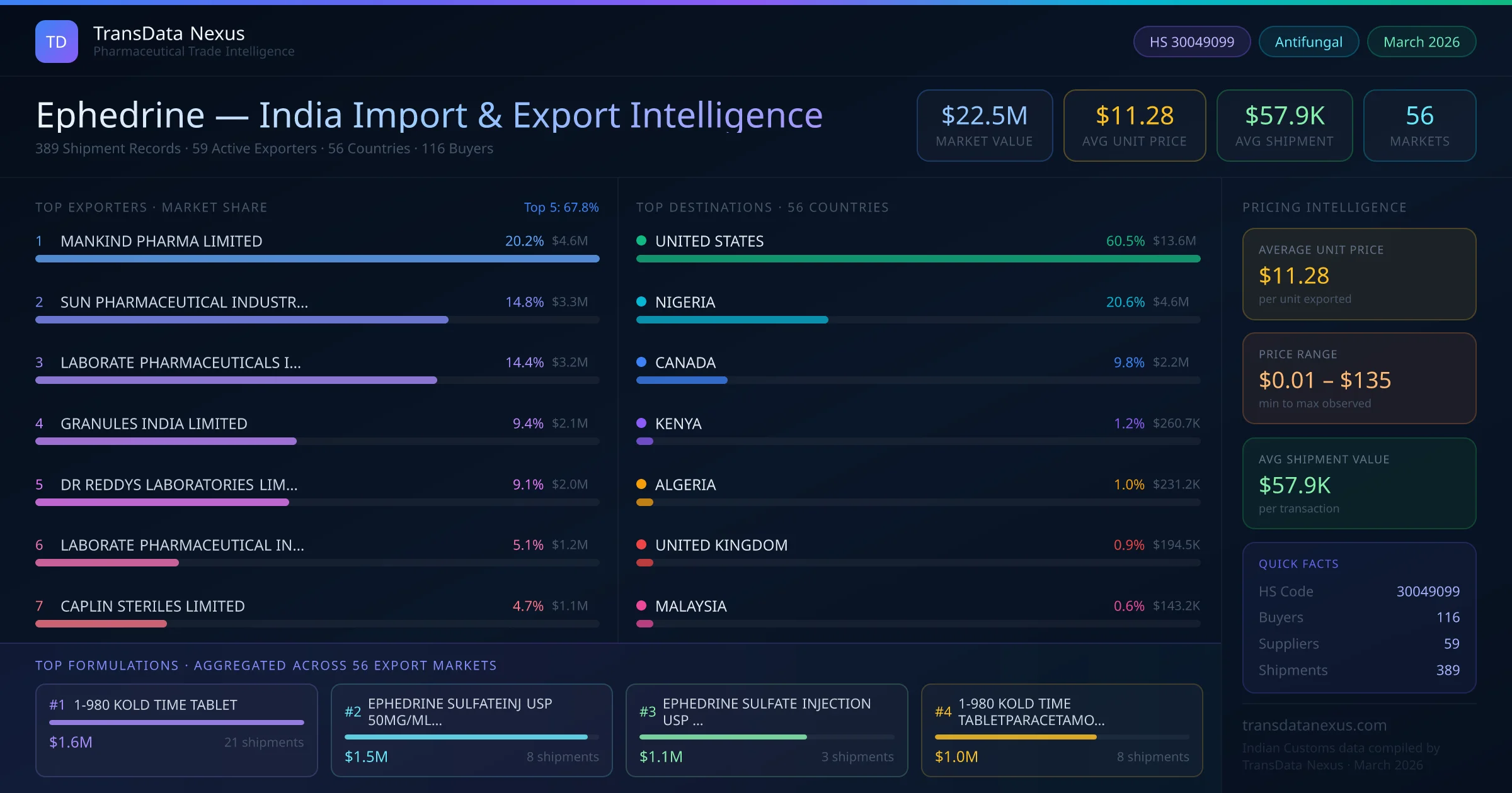 Between 2022 and 2026, India exported $22.5M worth of ephedrine across 389 verified shipments to 56 countries — covering 29% of world markets in the Respiratory & OTC segment. The largest destination is UNITED STATES (60.5%). MANKIND PHARMA LIMITED leads with a 20.2% share. All figures are drawn from Indian Customs (DGFT) shipping bill records spanning four years of trade activity.