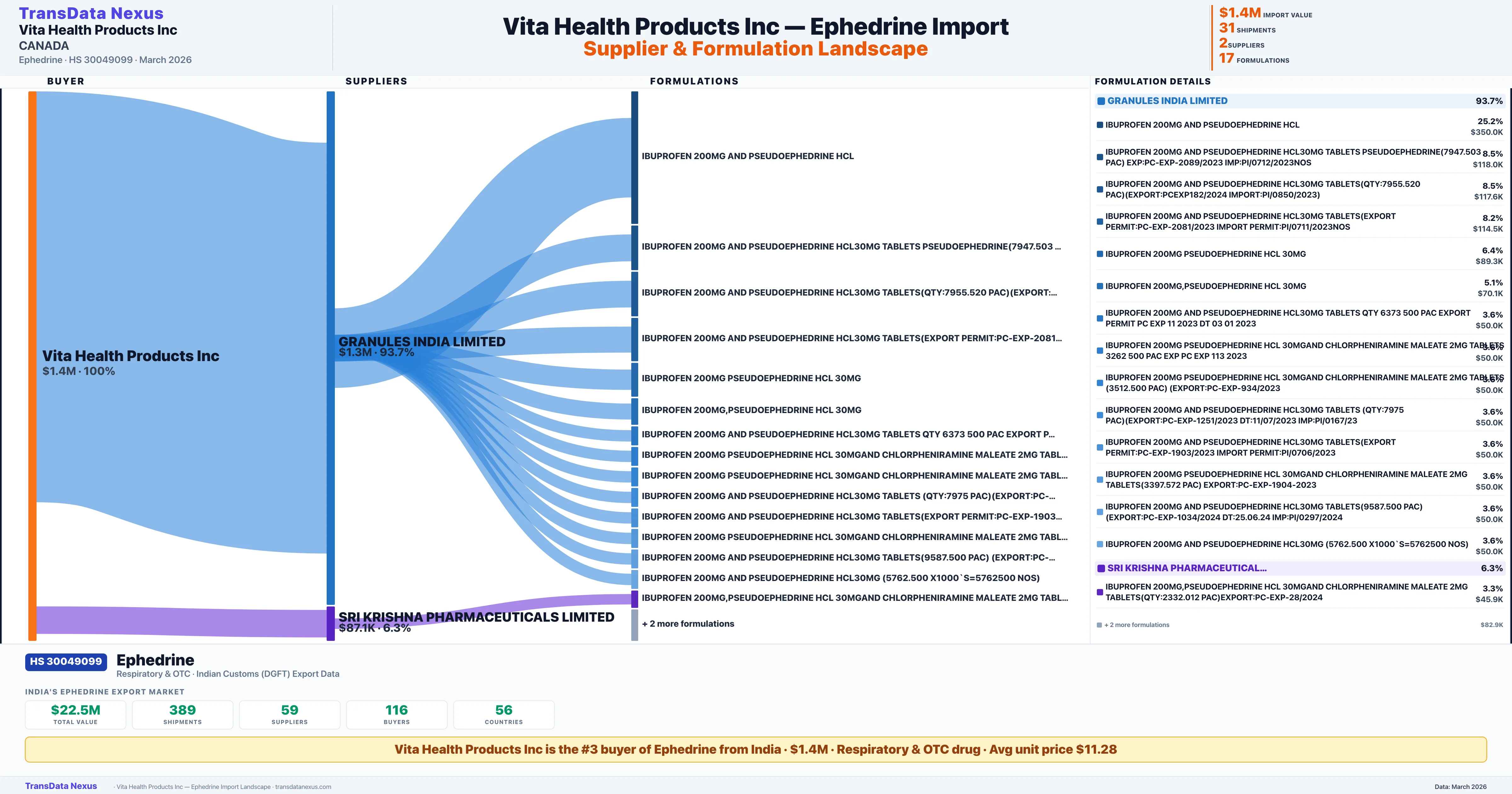 VITA HEALTH PRODUCTS INC sources Ephedrine from 2 verified Indian suppliers based on 31 customs records. The primary supplier is GRANULES INDIA LIMITED accounting for 93.7% of imports.