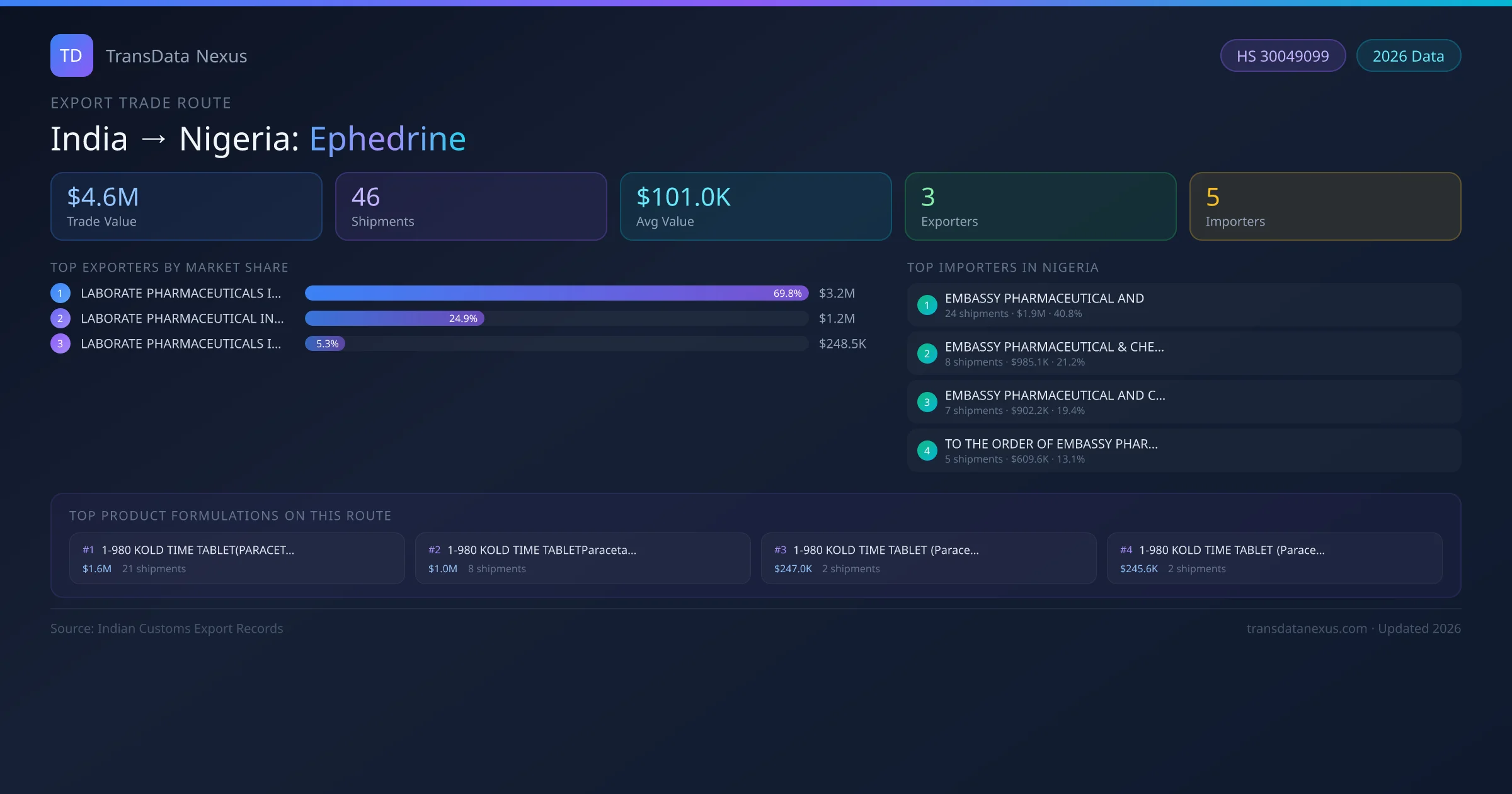 India has recorded 46 verified shipments of Ephedrine exported to Nigeria, representing a combined trade value of $4.6M USD. This corridor is served by 3 active Indian exporters, with an average shipment value of $101.0K USD. The leading Indian exporter is LABORATE PHARMACEUTICALS INDIA LTD, which accounts for 70% of total export value with 35 shipments worth $3.2M USD. On the buying side, EMBASSY PHARMACEUTICAL AND is the largest importer in Nigeria with $1.9M USD in purchases. The top 3 suppliers — LABORATE PHARMACEUTICALS INDIA LTD, LABORATE PHARMACEUTICAL INDIA LIMITED, LABORATE PHARMACEUTICALS INDIA LIMITED — together control 100% of total trade value on this route. All data sourced from Indian Customs (DGFT) shipping bill records. Values reported in FOB USD.