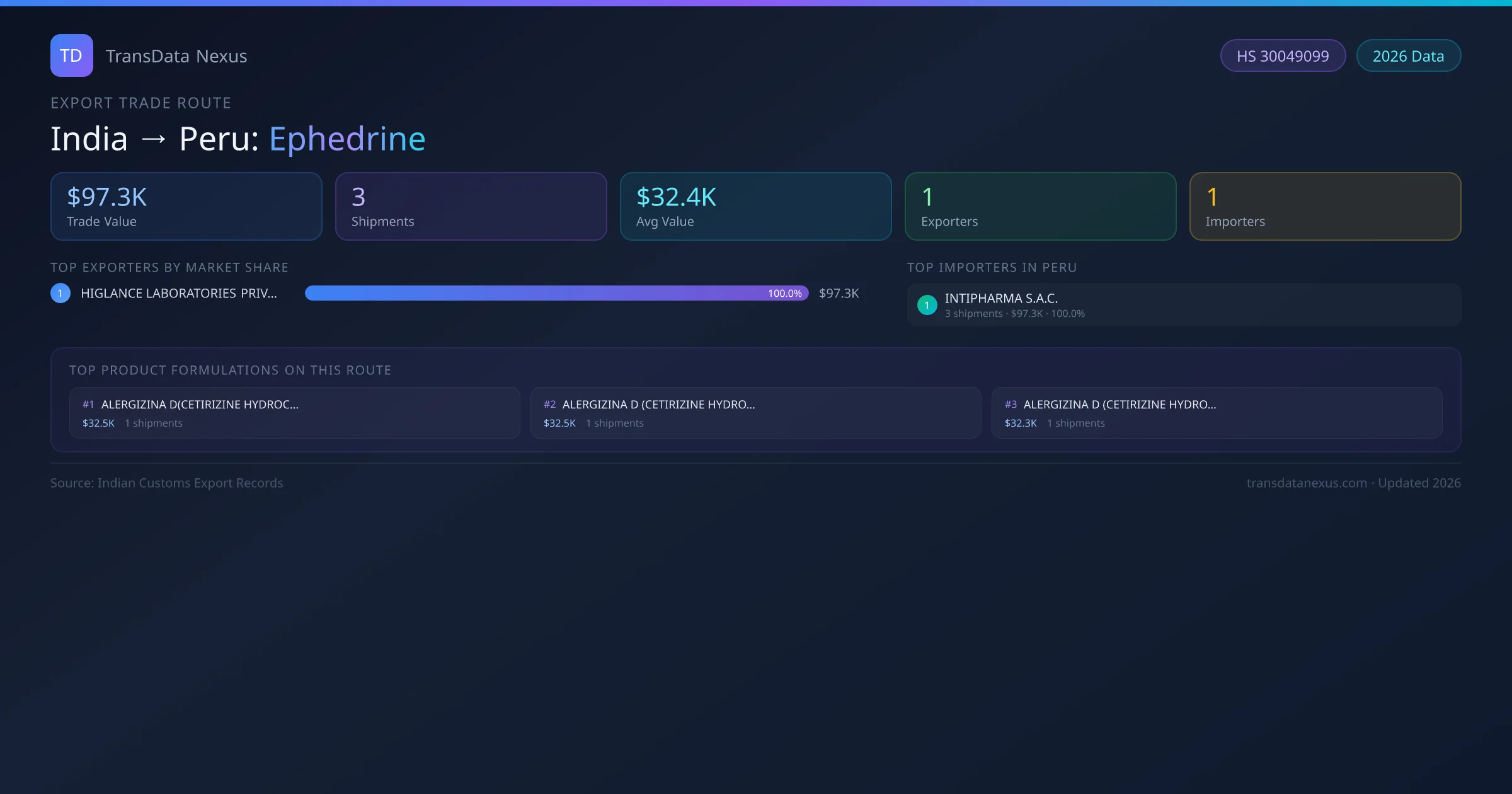 On the import side, key buyers of Indian ephedrine in Peru include INTIPHARMA S.A.C.. INTIPHARMA S.A.C. is the single largest importer with 3 shipments valued at $97.3K USD.