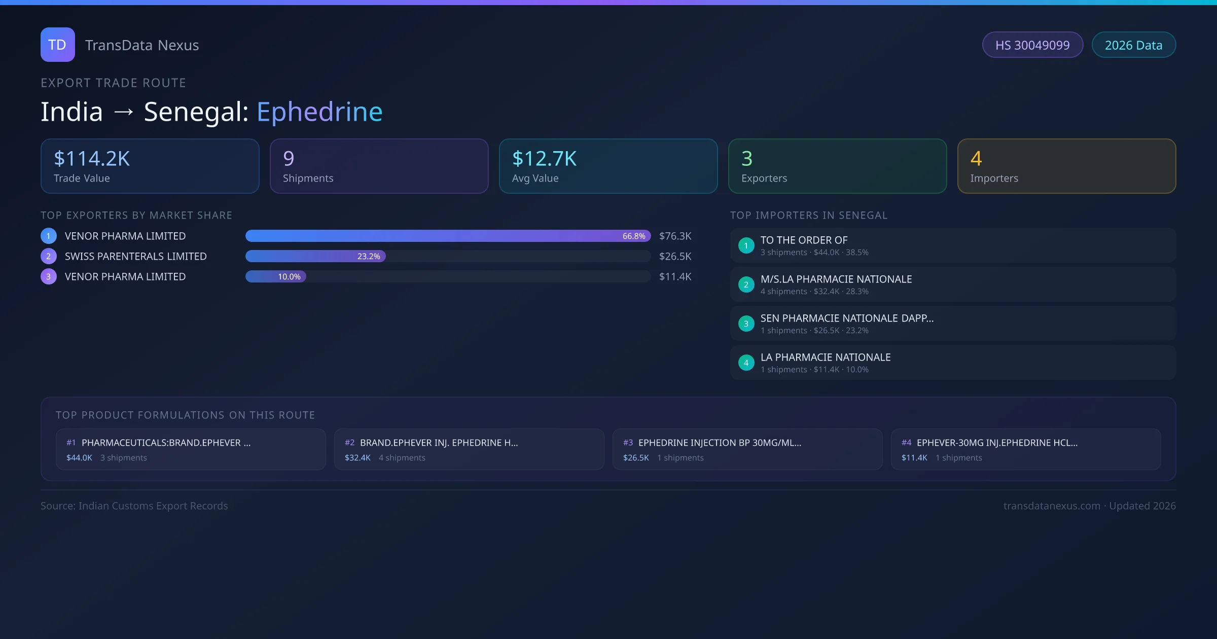 - 1.Route Identification: India to Senegal export trade corridor identified from Indian Customs (DGFT) records for Ephedrine.