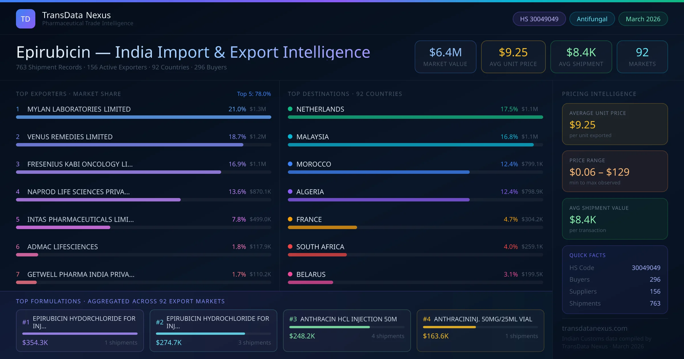 Between 2022 and 2026, India exported $6.4M worth of epirubicin across 763 verified shipments to 92 countries — covering 47% of world markets in the Advanced Oncology segment. The largest destination is NETHERLANDS (17.5%). MYLAN LABORATORIES LIMITED leads with a 21.0% share. All figures are drawn from Indian Customs (DGFT) shipping bill records spanning four years of trade activity.