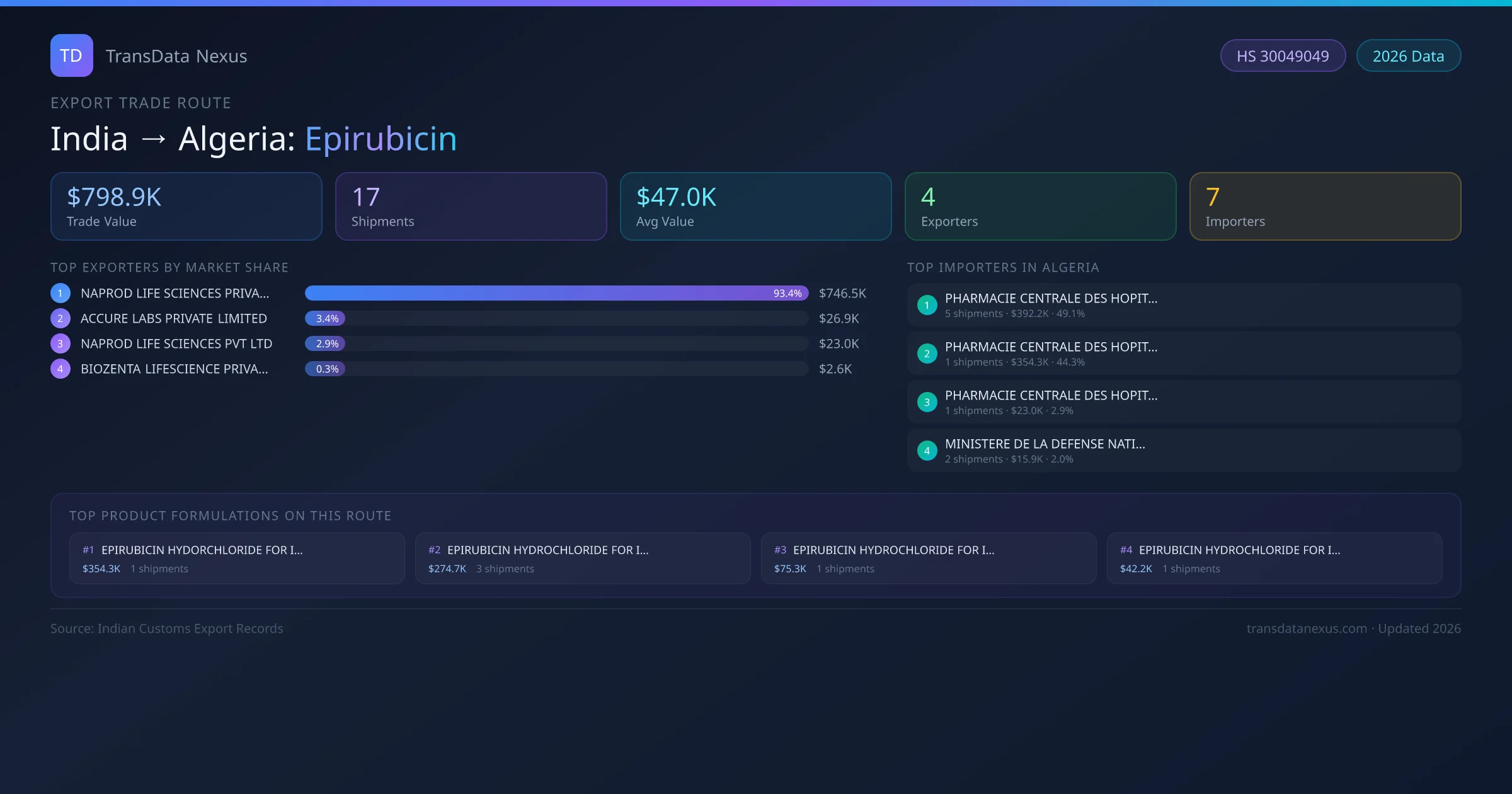 - 1.Route Identification: India to Algeria export trade corridor identified from Indian Customs (DGFT) records for Epirubicin.