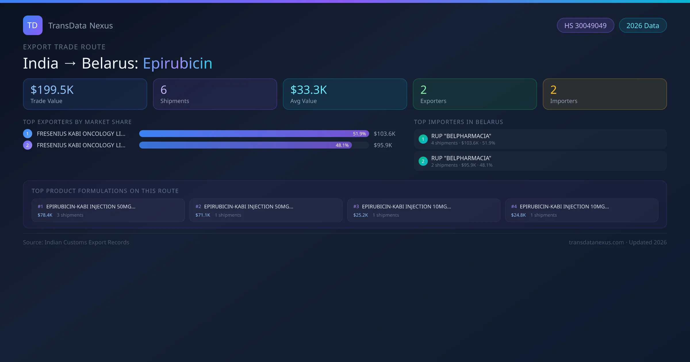 India has recorded 6 verified shipments of Epirubicin exported to Belarus, representing a combined trade value of $199.5K USD. This corridor is served by 2 active Indian exporters, with an average shipment value of $33.3K USD. The leading Indian exporter is FRESENIUS KABI ONCOLOGY LIMITED, which accounts for 52% of total export value with 4 shipments worth $103.6K USD. On the buying side, RUP "BELPHARMACIA" is the largest importer in Belarus with $103.6K USD in purchases. All data sourced from Indian Customs (DGFT) shipping bill records. Values reported in FOB USD.