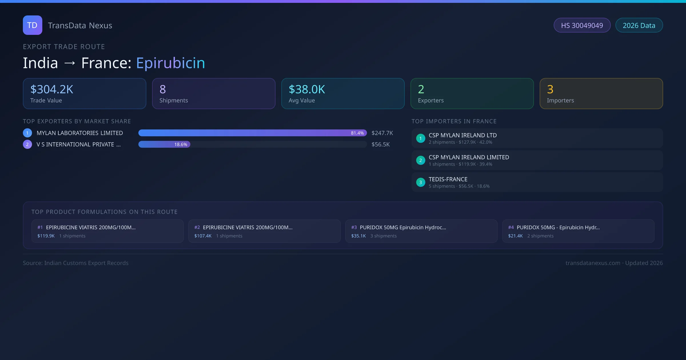 The India to France Epirubicin corridor is one of India's established pharmaceutical export routes, with 8 shipments documented worth a combined $304.2K USD. The route is dominated by MYLAN LABORATORIES LIMITED, which alone accounts for roughly 81% of all export value, reflecting the consolidated nature of India's epirubicin manufacturing sector.