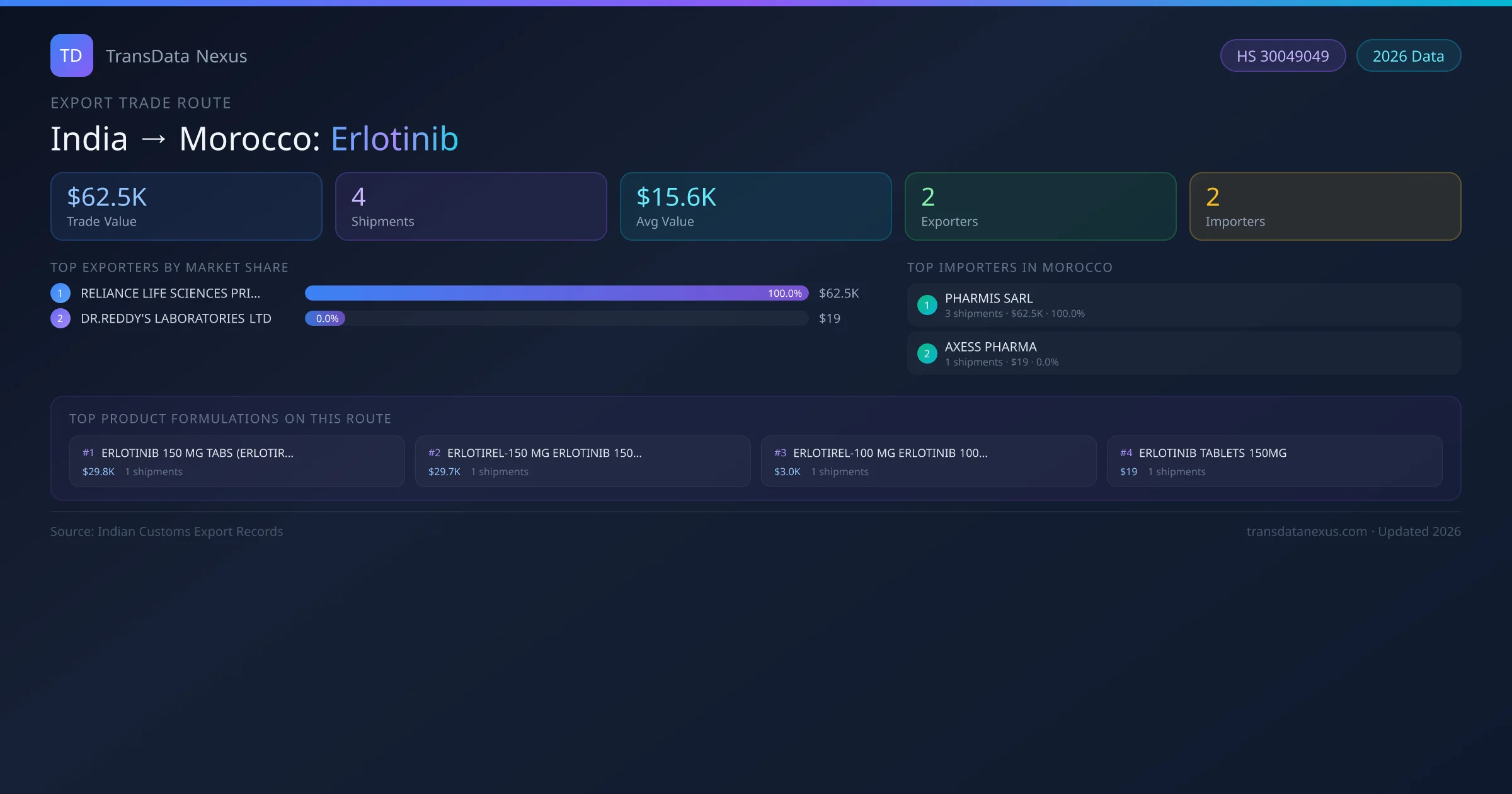 - 1.Route Identification: India to Morocco export trade corridor identified from Indian Customs (DGFT) records for Erlotinib.