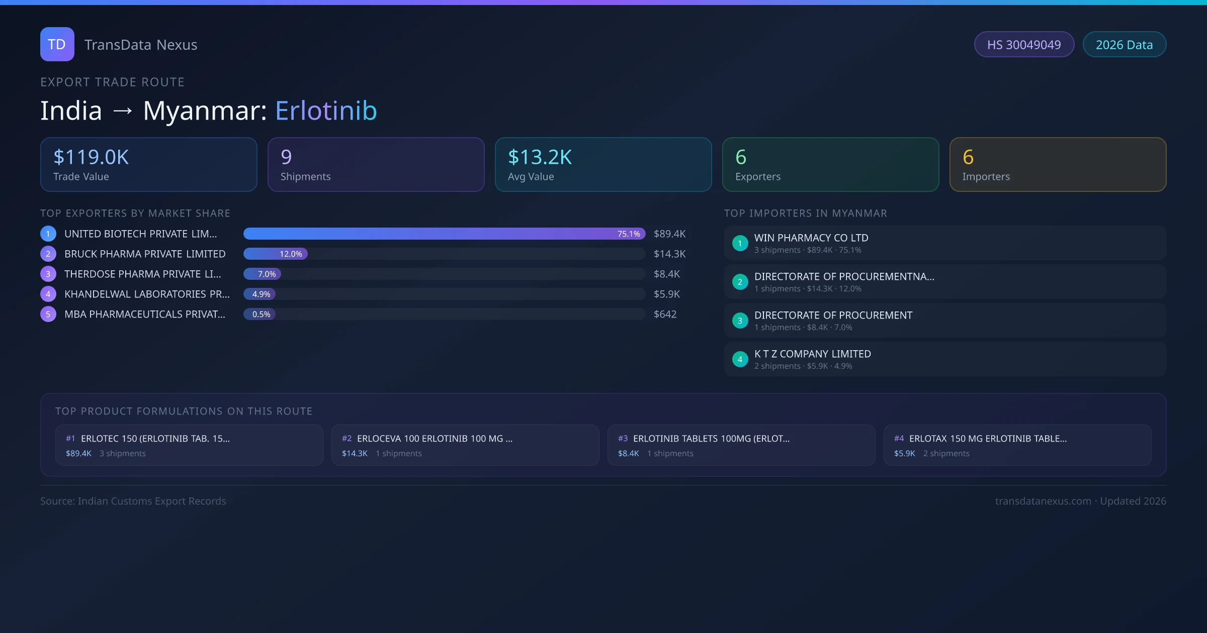 India has recorded 9 verified shipments of Erlotinib exported to Myanmar, representing a combined trade value of $119.0K USD. This corridor is served by 6 active Indian exporters, with an average shipment value of $13.2K USD. The leading Indian exporter is UNITED BIOTECH PRIVATE LIMITED, which accounts for 75% of total export value with 3 shipments worth $89.4K USD. On the buying side, WIN PHARMACY CO LTD is the largest importer in Myanmar with $89.4K USD in purchases. The top 3 suppliers — UNITED BIOTECH PRIVATE LIMITED, BRUCK PHARMA PRIVATE LIMITED, THERDOSE PHARMA PRIVATE LIMITED — together control 94% of total trade value on this route. All data sourced from Indian Customs (DGFT) shipping bill records. Values reported in FOB USD.