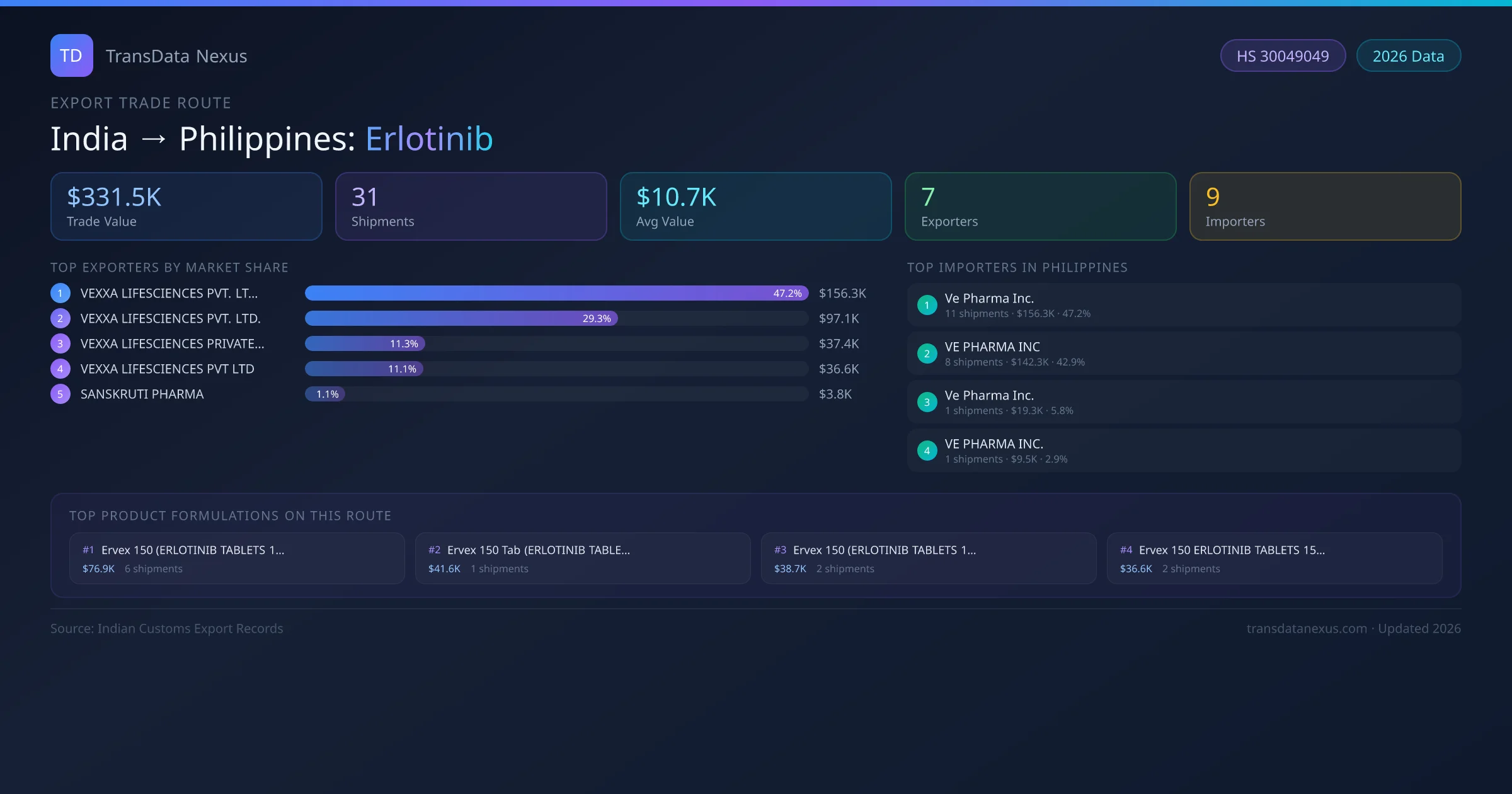 The India to Philippines Erlotinib corridor is one of India's established pharmaceutical export routes, with 31 shipments documented worth a combined $331.5K USD. The route is dominated by VEXXA LIFESCIENCES PVT. LTD. , which alone accounts for roughly 47% of all export value, reflecting the consolidated nature of India's erlotinib manufacturing sector.