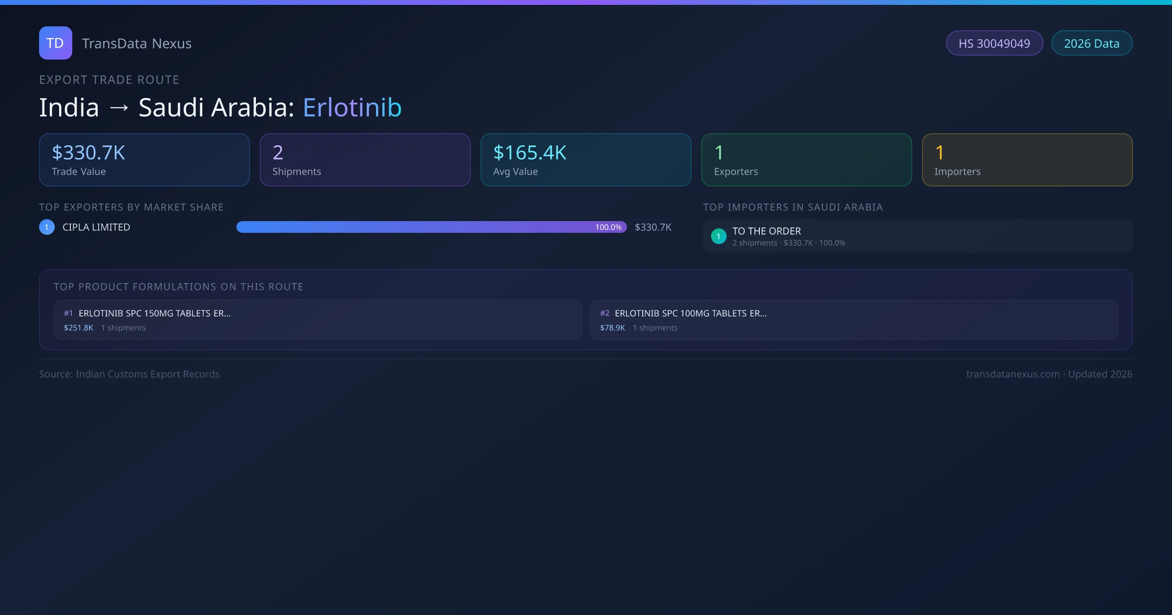 India has recorded 2 verified shipments of Erlotinib exported to Saudi Arabia, representing a combined trade value of $330.7K USD. This corridor is served by 1 active Indian exporters, with an average shipment value of $165.4K USD. The leading Indian exporter is CIPLA LIMITED, which accounts for 100% of total export value with 2 shipments worth $330.7K USD. On the buying side, TO THE ORDER is the largest importer in Saudi Arabia with $330.7K USD in purchases. All data sourced from Indian Customs (DGFT) shipping bill records. Values reported in FOB USD.