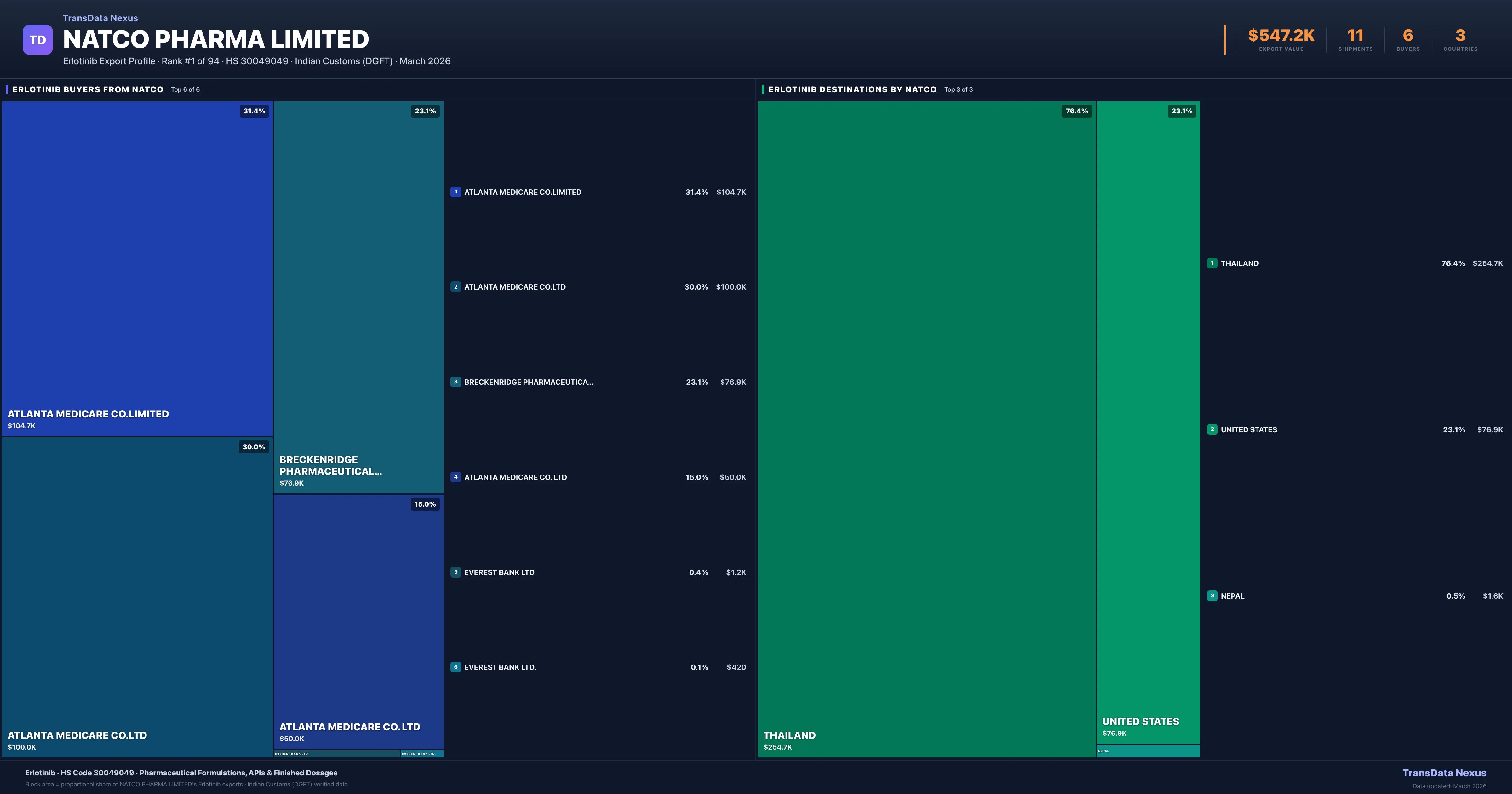 - 4.Verified Records: This page is backed by 11 individual customs records matching Natco Pharma Limited exporting Erlotinib, covering 9 formulations to 3 countries via 6 buyers.