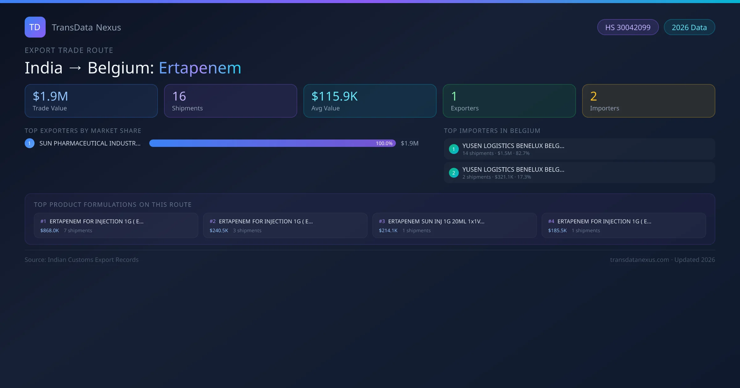 The India to Belgium Ertapenem corridor is one of India's established pharmaceutical export routes, with 16 shipments documented worth a combined $1.9M USD. The route is dominated by SUN PHARMACEUTICAL INDUSTRIES LIMITED, which alone accounts for roughly 100% of all export value, reflecting the consolidated nature of India's ertapenem manufacturing sector.