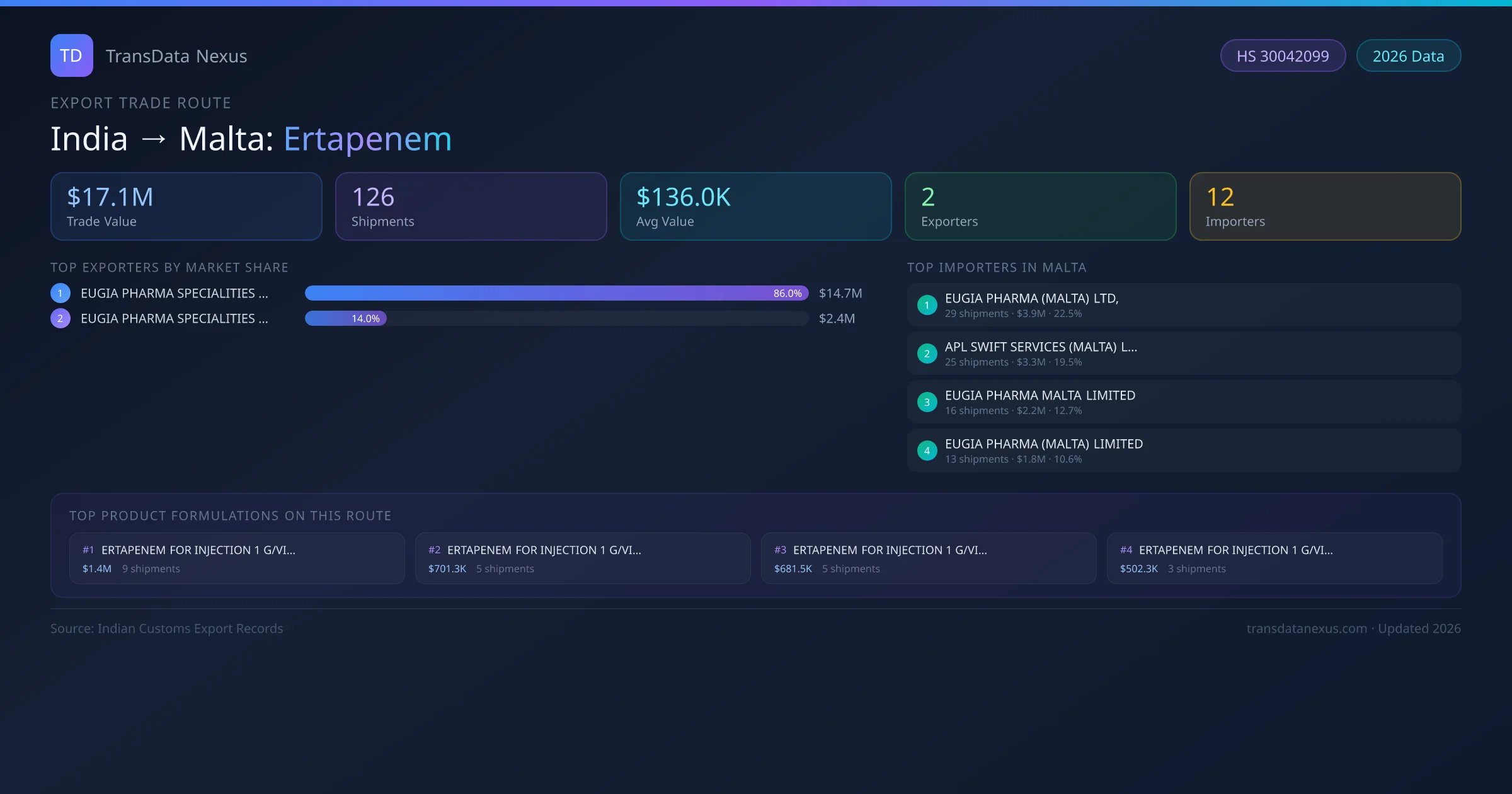 India exports Ertapenem to Malta worth approximately $17.1M USD across 126 recorded shipments. The average value per shipment is $136.0K USD.